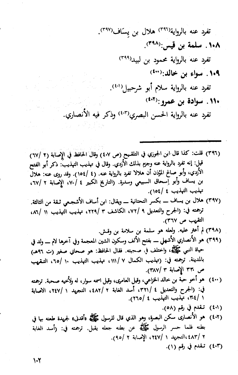 §110 - سَوَادَةُ بْنُ عَمْرٍو تَفَرَّدَ عَنْهُ بِالرِّوَايَةِ الْحَسَنُ الْبَصْرِيُّ، وَذَكَرَ فِيهِ الْأَنْصَارِيَّ