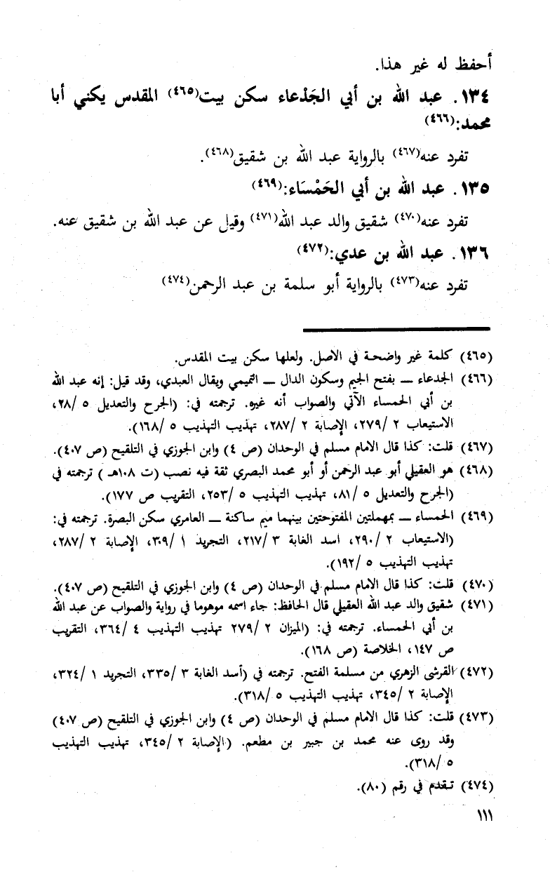 §135 - عَبْدُ اللَّهِ بْنُ أَبِي الْحَمْسَاءِ تَفَرَّدَ عَنْهُ شَقِيقٌ وَالِدُ عَبْدِ اللَّهِ، وَقِيلَ: عَنْ عَبْدِ اللَّهِ بْنِ شَقِيقٍ عَنْهُ