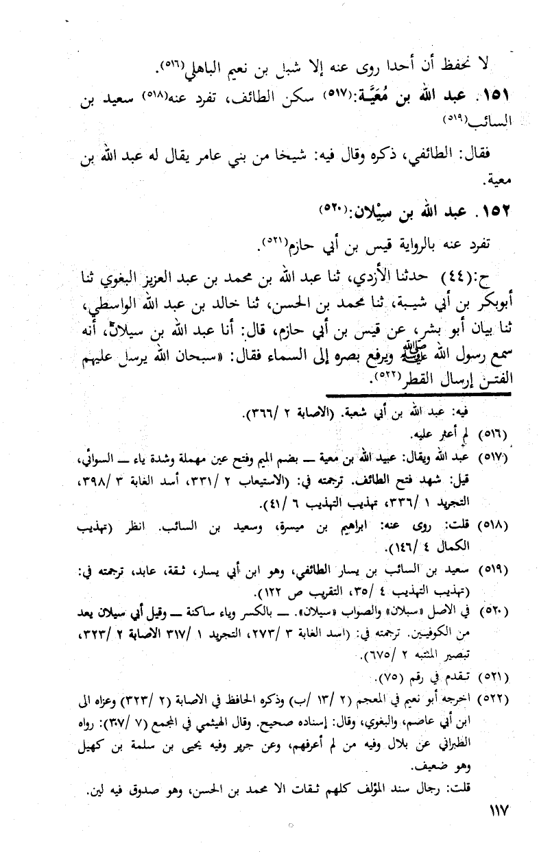 §151 - عَبْدُ اللَّهِ بْنُ مُعَيَّةَ سَكَنَ الطَّائِفَ، تَفَرَّدَ عَنْهُ سَعِيدُ بْنُ السَّائِبِ فَقَالَ: الطَّائِفِيَّ، ذَكَرَهُ وَقَالَ فِيهِ: شَيْخًا مِنْ بَنِي عَامِرٍ يُقَالُ لَهُ: عَبْدُ اللَّهِ بْنُ مُعَيَّةَ