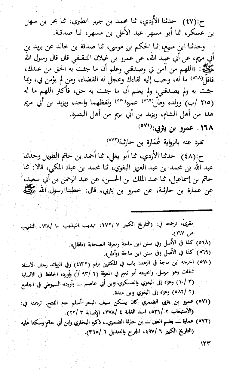 §168 - عَمْرُو بْنُ يَثْرِبِيٍّ تَفَرَّدَ عَنْهُ بِالرِّوَايَةِ عُمَارَةُ بْنُ حَارِثَةَ