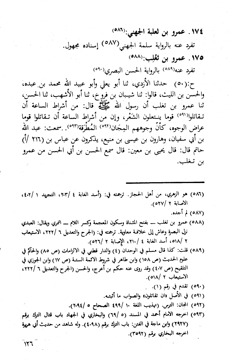 ثنا أَبُو يَعْلَى، وَأَبُو عُبَيْدِ اللَّهِ مُحَمَّدُ بْنُ عَبْدَةَ، وَالْحَسَنُ بْنُ اللَّيْثِ، قَالُوا ثنا شَيْبَانُ بْنُ فَرُّوخٍ، ثنا أَبُو الْأَشْهَبِ، ثنا الْحَسَنُ، ثنا عَمْرُو بْنُ تَغْلِبَ، أَنَّ رَسُولَ اللَّهِ صَلَّى اللهُ عَلَيْهِ وَسَلَّمَ قَالَ «§مِنْ أَشْرَاطِ السَّاعَةِ أَنْ تُقَاتِلُوا قَوْمًا يَنْتَعِلُونَ الشَّعَرَ، وَإِنَّ مِنْ أَشْرَاطِ السَّاعَةِ أَنْ تُقَاتِلُوا قَوْمًا عِرَاضَ الْوُجُوهِ، كَأَنَّ وُجُوهَهُمُ الْمَجَانُّ الْمُطْرَقَةُ» سَمِعْتُ عَبْدَ اللَّهِ بْنَ أَبِي سُفْيَانَ، وَهَارُونَ بْنَ عِيسَى بْنَ مَنِيعٍ، يَذْكُرُونَ عَنْ عَبَّاسِ بْنِ حَاتِمٍ قَالَ: قَالَ يَحْيَى بْنُ مَعِينٍ قَالَ: سَمِعَ الْحَسَنَ بْنَ أَبِي الْحَسَنِ مِنْ عَمْرِو بْنِ تَغْلِبَ
