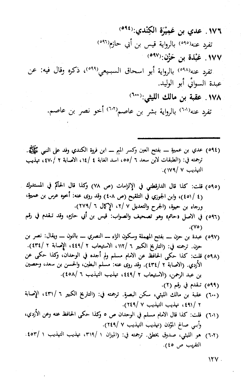 §177 - عَبْدَةُ بْنُ حَزْنٍ تَفَرَّدَ عَنْهُ بِالرِّوَايَةِ أَبُو إِسْحَاقَ السَّبِيعِيُّ، ذَكَرَهُ وَقَالَ فِيهِ: عَنْ عَبْدَةَ السُّوَائِيِّ أَبُو الْوَلِيدِ