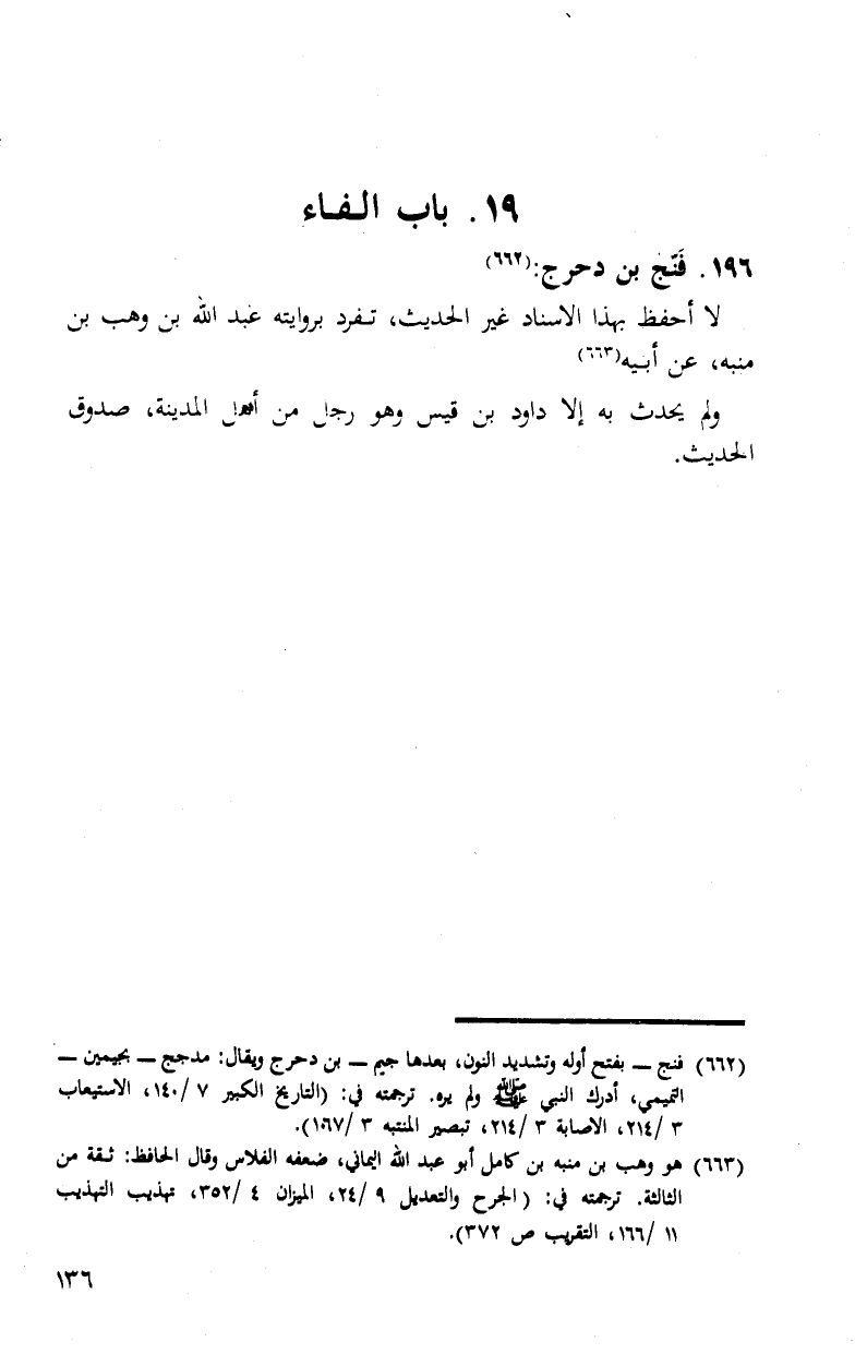 §196 - فَنَّجُ بْنُ دَحْرَجٍ لَا أَحْفَظُ بِهَذَا الْإِسْنَادِ غَيْرَ الْحَدِيثِ، تَفَرَّدَ بِرِوَايَتِهِ عَبْدُ اللَّهِ بْنُ وَهْبِ بْنِ مُنَبِّهٍ، عَنْ أَبِيهِ. وَلَمْ يُحَدِّثْ بِهِ إِلَّا دَاوُدُ بْنُ قَيْسٍ، وَهُوَ رَجُلٌ مِنْ أَهْلِ الْمَدِينَةِ صَدُوقُ الْحَدِيثِ