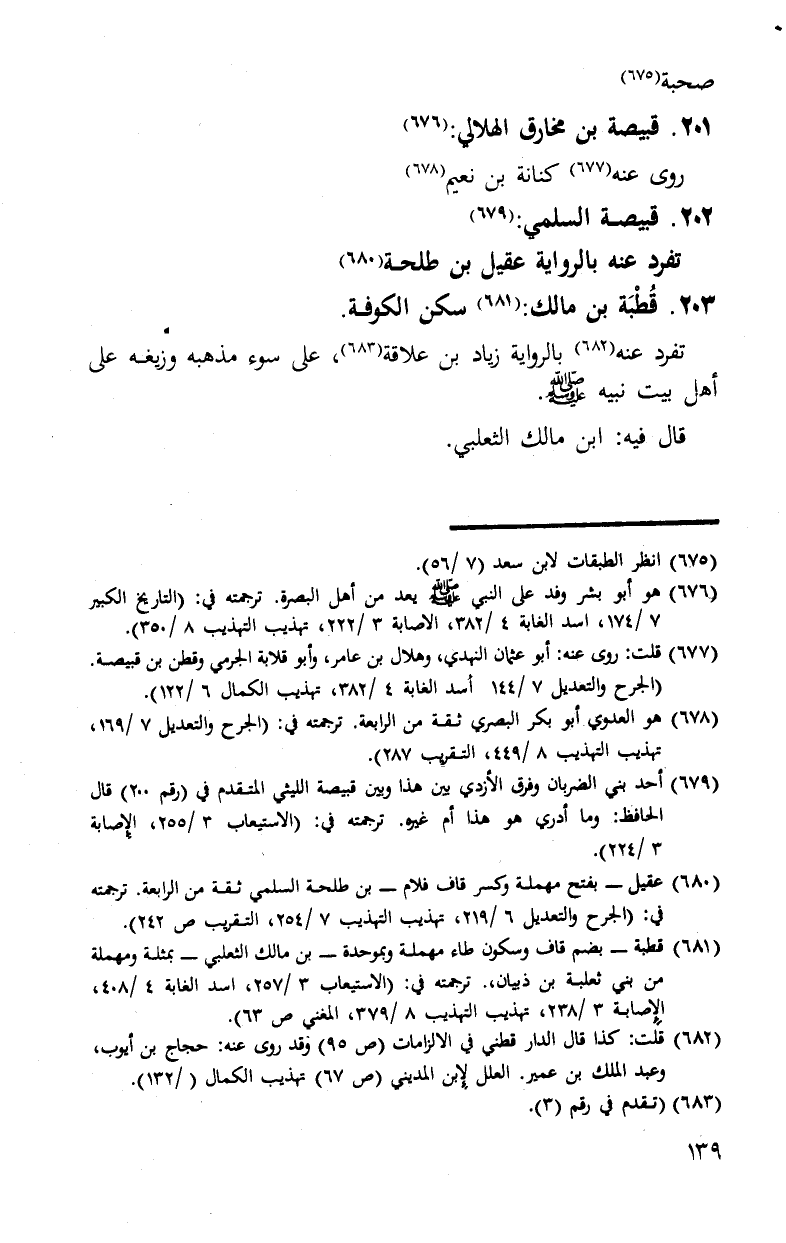 §203 - قُطْبَةُ بْنُ مَالِكٍ سَكَنَ الْكُوفَةَ، تَفَرَّدَ عَنْهُ بِالرِّوَايَةِ زِيَادُ بْنُ عِلَاقَةَ، عَلَى سُوءِ مَذْهَبِهِ وَزِيغِهِ عَلَى أَهْلِ بَيْتِ نَبِيِّهِ صَلَّى اللهُ عَلَيْهِ وَسَلَّمَ. قَالَ فِيهِ: ابْنَ مَالِكٍ الثَّعْلَبِيَّ