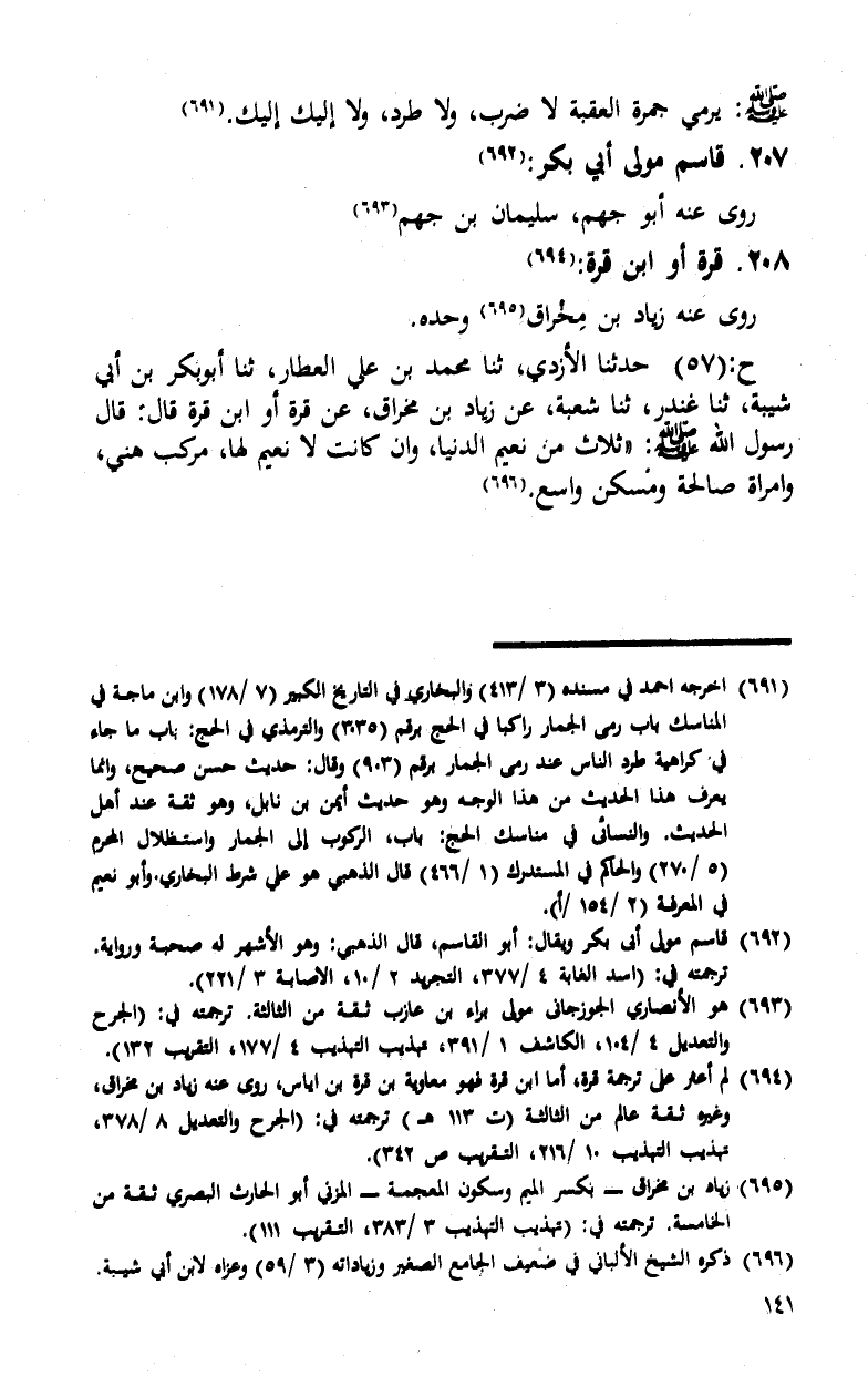 ثنا مُحَمَّدُ بْنُ عَلِيٍّ الْعَطَّارُ، ثنا أَبُو بَكْرِ بْنُ أَبِي شَيْبَةَ، ثنا شُعْبَةُ، عَنْ زِيَادِ بْنِ مِخْرَاقٍ، عَنْ قُرَّةَ أَوِ ابْنِ قُرَّةَ قَالَ: قَالَ رَسُولُ اللَّهِ صَلَّى اللهُ عَلَيْهِ وَسَلَّمَ «§ثَلَاثٌ مِنْ نَعِيمِ الدُّنْيَا، وَإِنْ كَانَتْ لَا نَعِيمَ لَهَا، مَرْكَبٌ هَنِيٌّ، وَامْرَأَةٌ صَالِحَةٌ، وَمَسْكَنٌ وَاسِعٌ»