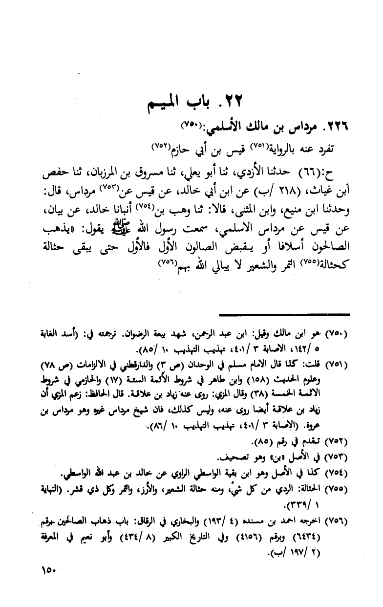ثنا أَبُو يَعْلَى، ثنا مَسْرُوقُ بْنُ الْمَرْزُبَانِ، ثنا حَفْصُ بْنُ غِيَاثٍ، عَنِ ابْنِ أَبِي خَالِدٍ، عَنْ قَيْسٍ، عَنْ مِرْدَاسٍ قَالَ وَحَدَّثَنَا ابْنُ مَنِيعٍ، وَابْنُ الْمُثَنَّى قَالَا ثنا وَهْبُ بْنُ بَقِيَّةَ، أَنْبَأَنَا خَالِدٌ، عَنْ بَيَانٍ، عَنْ قَيْسٍ، عَنْ مِرْدَاسٍ الْأَسْلَمِيِّ سَمِعْتُ رَسُولَ اللَّهِ صَلَّى اللهُ عَلَيْهِ وَسَلَّمَ يَقُولُ «§يَذْهَبُ الصَّالِحُونَ أَسْلَافًا، أَوْ يُقْبَضُ الصَّالِحُونَ الْأَوَّلَ فَالْأَوَّلَ، حَتَّى يَبْقَى حُثَالَةٌ كَحُثَالَةِ التَّمْرِ وَالشَّعِيرِ، لَا يُبَالِي اللَّهُ بِهِمْ»