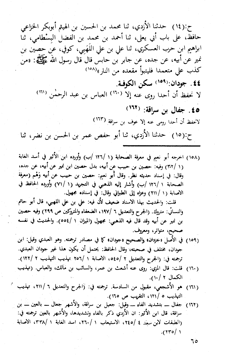 ثنا مُحَمَّدُ بْنُ الْحُسَيْنِ بْنِ الْهَيْثَمِ أَبُو بَكْرٍ الْخُزَاعِيُّ، حَافِظٌ عَلَى بَابِ أَبِي يَعْلَى، ثنا أَحْمَدُ بْنُ مُحَمَّدِ بْنِ الْفَضْلِ الْبِسْطَامِيُّ، ثنا إِبْرَاهِيمُ بْنُ حَرْبٍ الْعَسْكَرِيُّ، ثنا عَلِيُّ بْنُ عَلِيٍّ اللَّهَبِيُّ، كُوفِيٌّ، عَنْ حُصَيْنِ بْنِ نُمَيْرٍ، عَنْ أَبِيهِ، عَنْ جَدِّهِ، عَنْ جَابِرِ بْنِ حَابِس ٍ قَالَ: قَالَ رَسُولُ اللَّهِ صَلَّى اللهُ عَلَيْهِ وَسَلَّمَ §«مَنْ كَذَبَ عَلَيَّ مُتَعَمِّدًا فَلْيَتَبَوَّأْ مَقْعَدَهُ مِنَ النَّارِ»