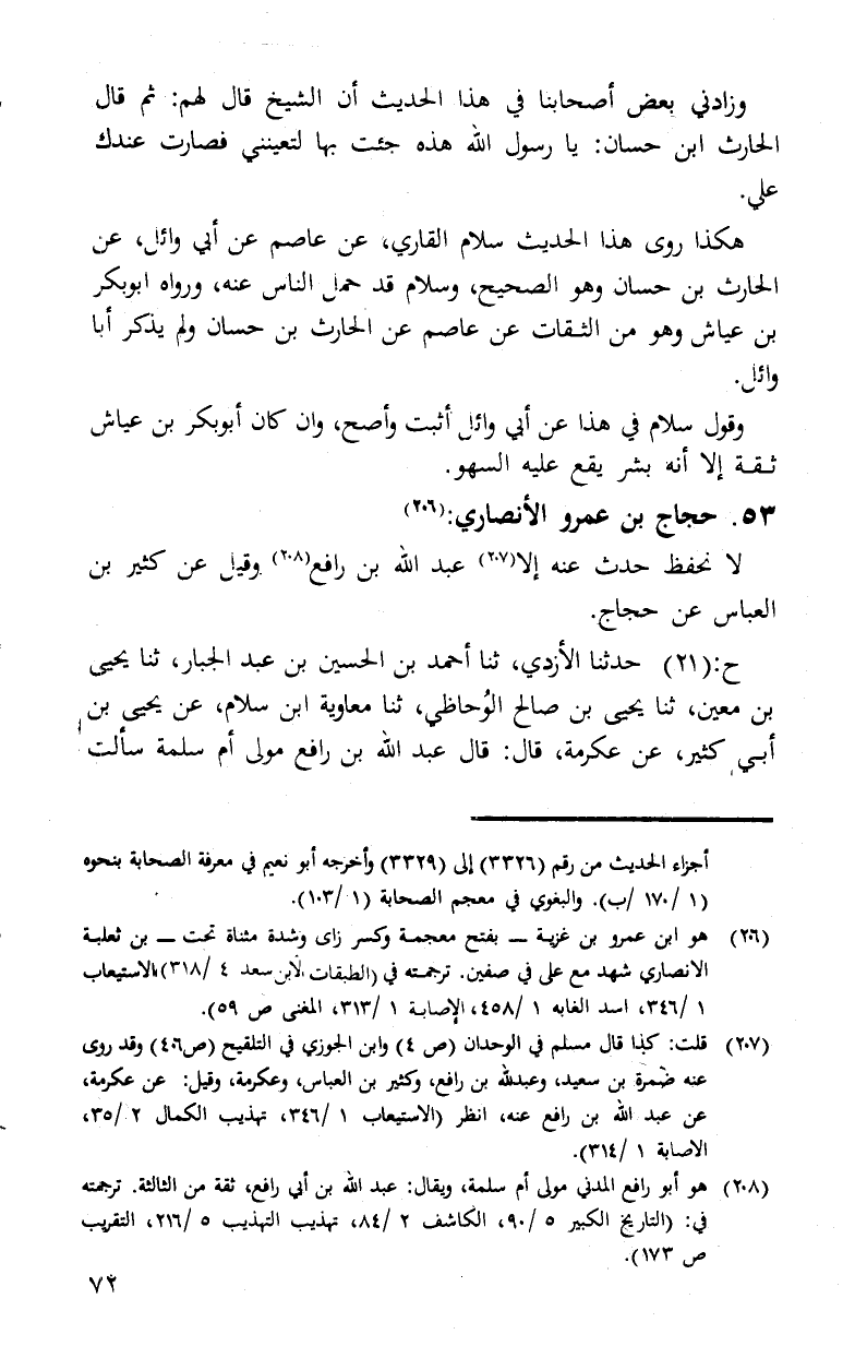 §53 - حَجَّاجُ بْنُ عَمْرٍو الْأَنْصَارِيُّ لَا نَحْفَظُ حَدَّثَ عَنْهُ، إِلَّا عَبْدُ اللَّهِ بْنُ رَافِعٍ، وَقِيلَ: عَنْ كَثِيرِ بْنِ الْعَبَّاسِ، عَنْ حَجَّاجٍ