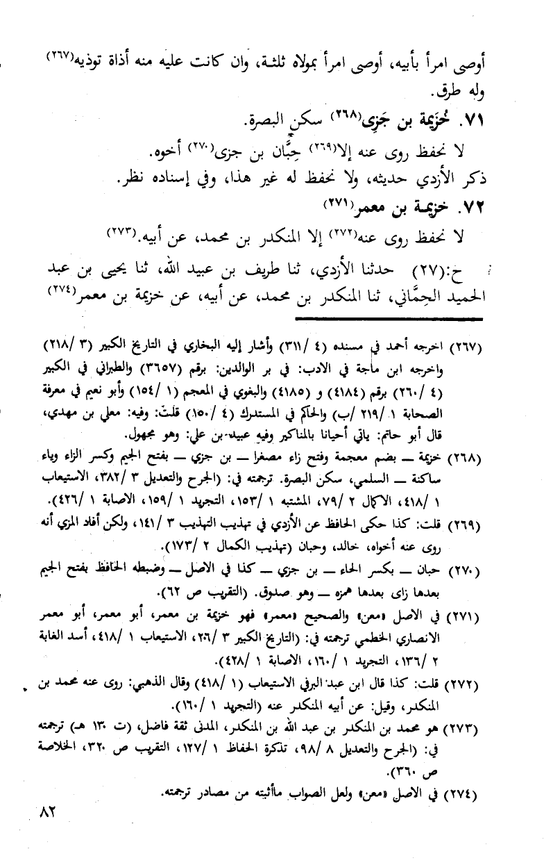§71 - خُزَيْمَةُ بْنُ جُزِيٍّ سَكَنَ الْبَصْرَةَ. لَا نَحْفَظُ رَوَى عَنْهُ، إِلَّا حِبَّانُ بْنُ جُزِيٍّ أَخُوهُ. ذَكَرَ الْأَزْدِيُّ حَدِيثَهُ، وَلَا نَحْفَظُ لَهُ غَيْرَ هَذَا، وَفِي إِسْنَادِهِ نَظَرٌ