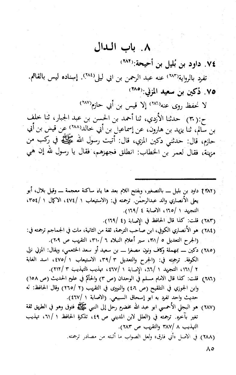 §74 - دَاوُدُ بْنُ بُلَيْلِ بْنِ أُحَيْحَةَ تَفَرَّدَ بِالرِّوَايَةِ عَنْهُ عَبْدُ الرَّحْمَنِ بْنُ أَبِي لَيْلَى، إِسْنَادُهُ لَيْسَ بِالْقَائِمِ