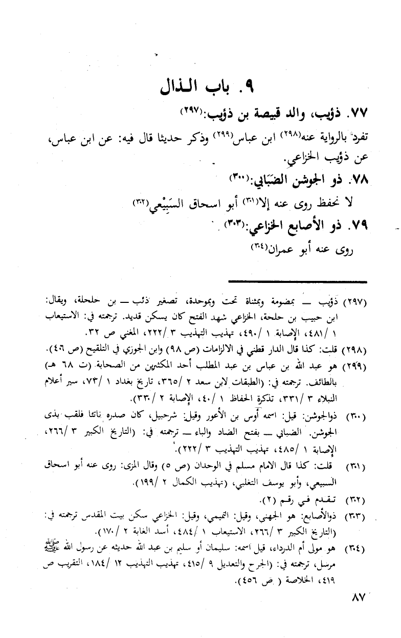 §77 - ذُؤَيْبٌ وَالِدُ قَبِيصَةَ بْنِ ذُؤَيْبٍ تَفَرَّدَ بِالرِّوَايَةِ عَنْهُ ابْنُ عَبَّاسٍ، وَذَكَرَ حَدِيثًا قَالَ فِيهِ: عَنِ ابْنِ عَبَّاسٍ، عَنْ ذُؤَيْبٍ الْخُزَاعِيِّ