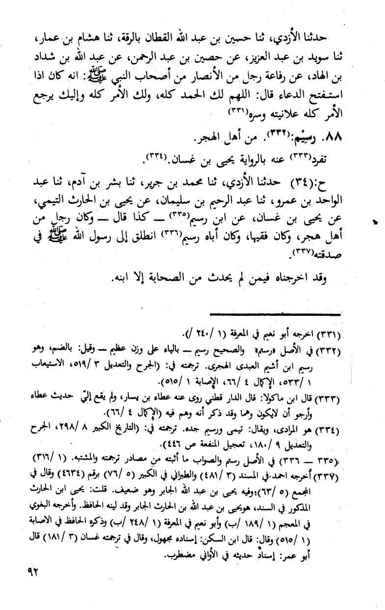 §88 - رَسِيمٌ مِنْ أَهْلِ الْهَجَرِ. تَفَرَّدَ عَنْهُ بِالرِّوَايَةِ يَحْيَى بْنُ غَسَّانَ ثنا مُحَمَّدُ بْنُ جَرِيرٍ، ثنا بِشْرُ بْنُ آدَمَ، ثنا عَبْدُ الْوَاحِدِ بْنُ عَمْرٍو، ثنا عَبْدُ الرَّحِيمِ بْنُ سُلَيْمَانَ، عَنْ يَحْيَى بْنِ الْحَارِثِ التَّيْمِيِّ، عَنْ يَحْيَى بْنِ غَسَّانَ، عَنِ ابْنِ رَسِيمٍ، كَذَا قَالَ، " وَكَانَ رَجُلًا مِنْ أَهْلِ هَجَرَ، وَكَانَ فَقِيهًا، وَكَانَ أَبَاهُ رَسِيمٌ انْطَلَقَ إِلَى رَسُولِ اللَّهِ صَلَّى اللهُ عَلَيْهِ وَسَلَّمَ فِي صَدَقَتِهِ. وَقَدْ أَخْرَجْنَاهُ فِيمَنْ لَمْ يُحَدِّثْ مِنَ الصَّحَابَةِ إِلَّا ابْنَهُ