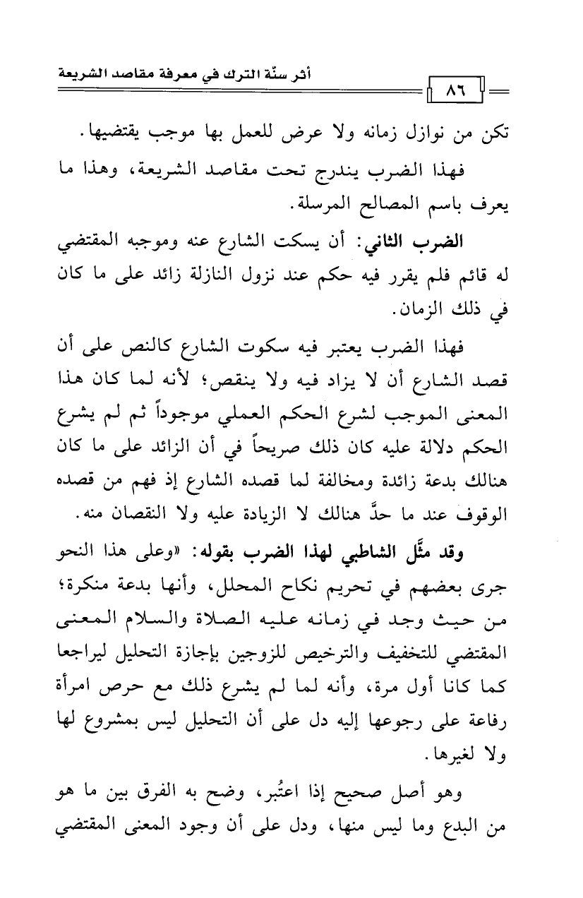 وقد مَثَّل الشاطبي لهذا الضرب بقوله: "وعلى هذا النحو جرى بعضهم في تحريم نكاح المحلل، وأنها بدعة منكرة؛ من حيث وجد في زمانه - عليه الصلاة والسلام - المعنى المقتضي للتخفيف والترخيص للزوجين بإجازة التحليل ليراجعا كما كان أول مرة، وأنه لما لم يشرع ذلك مع حرص امرأة رفاعة على رجوعها إليه دَلَّ على أن التحليل ليس بمشروع لها ولا لغيرها.