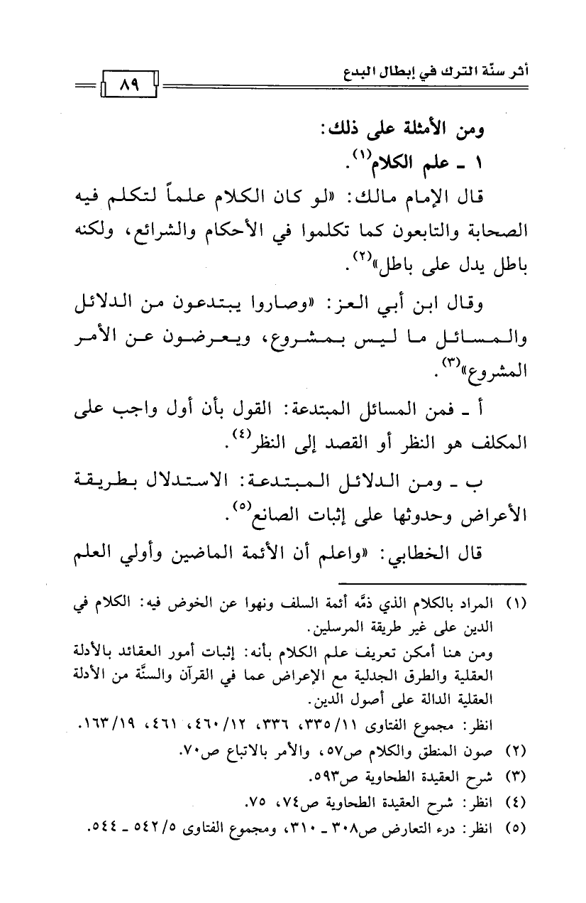 وقال ابن أبي العز: "وصاروا يبتدعون من الدلائل والمسائل ما ليس بمشروع، ويُعرضون عن الأمر المشروع" (¬3).
