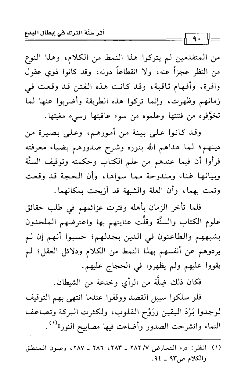 من المتقدمين لم يتركوا هذا النمط من الكلام، وهذا النوع من النظر عجزًا عنه، ولا انقطاعًا دونه، وقد كانوا ذوي عقول وافرة، وأفهام ثاقبة، وقد كانت هذه الفتن قد وقعت في زمانهم وظهرت, وإنما تركوا هذه الطريقة وأضربوا عنها لمَّا تخوفوه من فتنتها وعلموه من سوء عاقبتها وسيء مغبتها.