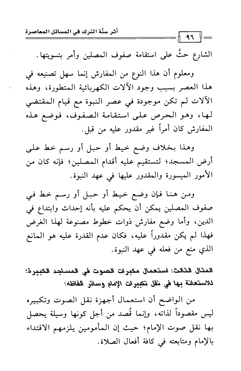 ومن هنا فإن وضع خيط أو حبل أو رسم خط في صفوف لمصلين يمكن أن يحكم عليه بأنه إحداث وابتداع في الدين، وأما وضع مفارش ذوات خطوط مصنوعة لهذا الغرض فهذا لم يكن مقدورًا عليه، فكان عدم القدرة عليه هو المانع الذي منع من فعله في عهد النبوة.