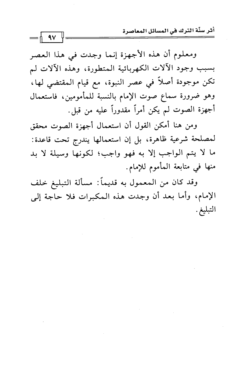 ومعلوم أن هذه الأجهزة إنما وُجدت في هذا العصر بسبب وجود الآلات الكهربائية المتطورة، وهذه الآلات لم تكن موجودة أصلا في عصر النبوة مع قيام المقتضي لها، وهو ضرورة لسماع صوت الإمام بالنسبة للمأمومين، فاستعمال أجهزة الصوت لم يكن أمرًا مقدورًا عليه من قبل.
