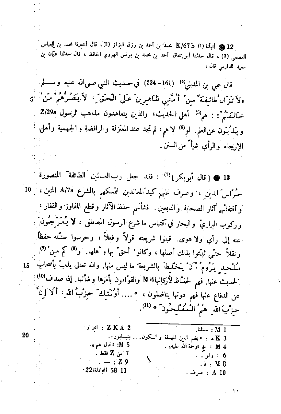 أَنْبَأَنَا مُحَمَّدُ بْنُ أَحْمَدَ بْنِ رِزْقٍ الْبَزَّازُ، قَالَ: أَخْبَرَنَا مُحَمَّدُ بْنُ الْعَبَّاسِ الْعَصَمِيُّ، قَالَ: حَدَّثَنَا أَبُو إِسْحَاقَ أَحْمَدُ بْنُ مُحَمَّدِ بْنِ يُونُسَ الْهَرَوِيُّ الْحَافِظُ، قَالَ: حَدَّثَنَا عُثْمَانُ بْنُ سَعِيدٍ الدَّارِمِيُّ، قَالَ: قَالَ عَلِيُّ بْنُ الْمَدِينِيِّ فِي حَدِيثِ النَّبِيِّ صَلَّى اللهُ عَلَيْهِ وَسَلَّمَ «§لَا تَزَالُ طَائِفَةٌ مِنْ أُمَّتِي ظَاهِرِينَ عَلَى الْحَقِّ، لَا يَضُرُّهُمُ مَنْ خَالَفَهُمْ» : «هُمْ أَهْلُ الْحَدِيثِ، وَالَّذِينَ يَتَعَاهَدُونَ مَذَاهِبَ الرَّسُولِ، وَيَذُبُّونَ عَنِ الْعِلْمِ. لَوْلَاهُمْ، لَمْ تَجِدْ عِنْدَ الْمُعْتَزِلَةِ وَالرَّافِضَةِ وَالْجَهْمِيَّةِ وَأَهْلِ الْإِرْجَاءِ وَالرَّأْيِ شَيْئًا مِنَ السُّنَنِ» قَالَ أَبُو بَكْرٍ: فَقَدْ جَعَلَ رَبُّ الْعَالَمِينَ الطَّائِفَةَ الْمَنْصُورَةَ حُرَّاسَ الدِّينِ، وَصَرَفَ عَنْهُمْ كَيَدَ الْمُعَانِدِينَ؛ لِتَمَسُّكِهِمْ بِالشَّرْعِ الْمَتِينِ، وَاقْتِفَائِهِمْ آثَارَ الصَّحَابَةِ وَالتَّابِعِينَ. فَشَأْنُهُمْ حِفْظُ الْآثَارِ وَقَطْعُ الْمَفَاوِزِ وَالْقِفَارِ، وَرُكُوبُ الْبَرَارِيِّ وَالَبِحَارِ فِي اقْتِبَاسِ مَا شَرَعَ الرَّسُولُ الْمُصْطَفَى، لَا يُعَرِّجُونَ عَنْهُ إِلَى رَأْيٍ وَلَا هَوًى. قَبِلُوا شَرِيعَتَهُ قَوْلًا وَفِعْلًا، وَحَرَسُوا سُنَّتَهُ حِفْظًا وَنَقَلًا حَتَّى ثَبَّتُوا بِذَلِكَ أَصْلَهَا، وَكَانُوا أَحَقَّ بِهَا وَأَهْلَهَا. وَكَمْ مِنْ مُلْحِدٍ يَرُومُ أَنْ يَخْلِطَ بِالشَّرِيعَةِ مَا لَيْسَ مِنْهَا. وَاللَّهُ تَعَالَى يَذُبُّ بِأَصْحَابِ الْحَدِيثِ عَنْهَا. فَهُمُ الْحُفَّاظُ لِأَرْكَانِهَا وَالْقَوَّامُونَ بِأَمْرِهَا وَشَأْنِهَا. إِذَا صَدَفَ عَنِ الدِّفَاعِ عَنْهَا فَهُمْ دُونَهَا يُنَاضِلُونَ، { «أُولَئِكَ حِزْبُ اللَّهِ أَلَا إِنَّ حِزْبَ اللَّهِ هُمُ الْمُفْلِحُونَ» } [المجادلة: 22]