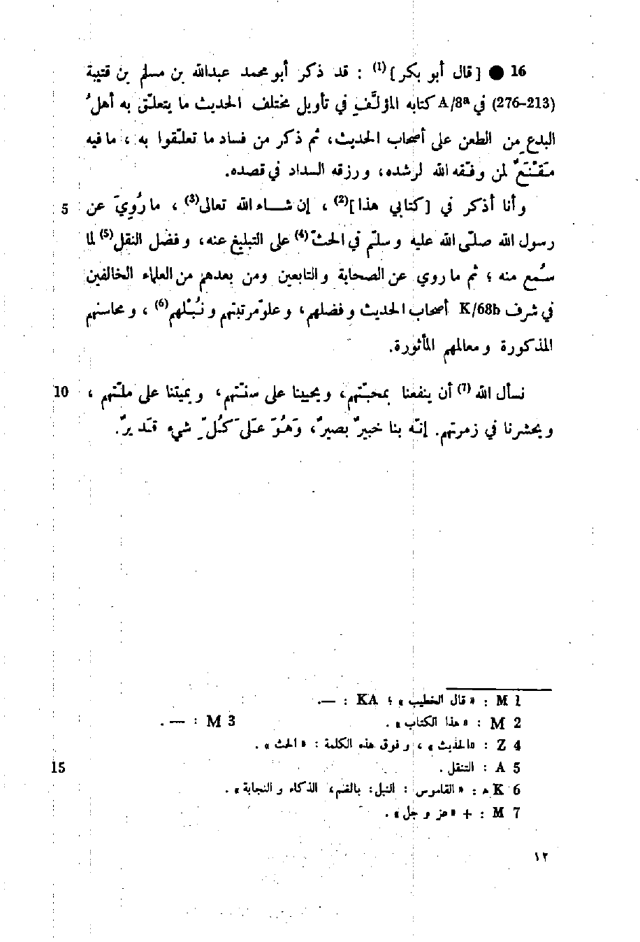 قَالَ أَبُو بَكْرٍ: «قَدْ ذَكَرَ أَبُو مُحَمَّدٍ عَبْدُ اللَّهِ بْنُ مُسْلِمِ بْنِ قُتَيْبَةَ فِي كِتَابِهِ الْمُؤَلَّفِ فِي تَأْوِيلِ مُخْتَلِفِ الْحَدِيثِ مَا يَتَعَلَّقُ بِهِ أَهْلُ الْبِدَعِ مِنَ الطَّعْنِ عَلَى أَصْحَابِ الْحَدِيثِ، ثُمَّ ذَكَرَ مِنْ فَسَادِ مَا تَعَلَّقُوا بِهِ، مَا فِيهِ مُقْنِعٌ لِمَنْ وَفَّقَهُ اللَّهُ لِرُشْدِهِ، وَرَزَقَهُ السَّدَادَ فِي قَصْدِهِ. وَأَنَا أَذْكُرُ فِي كِتَابِي هَذَا، إِنْ شَاءَ اللَّهُ تَعَالَى، مَا رُوِيَ عَنْ رَسُولِ اللَّهِ صَلَّى اللهُ عَلَيْهِ وَسَلَّمَ فِي الْحَثِّ عَلَى التَّبْلِيغِ عَنْهُ، وَفَضْلِ النَّقْلِ لِمَا سُمِعَ مِنْهُ، ثُمَّ مَا رُوِيَ عَنِ الصَّحَابَةِ وَالتَّابِعِينَ وَمَنْ بَعْدَهُمْ مِنَ الْعُلَمَاءِ الْخَالِفِينَ فِي شَرَفِ أَصْحَابِ الْحَدِيثِ وَفَضْلِهِمْ، وَعُلُوِّ مَرْتَبَتِهِمْ وَنُبْلِهِمْ، وَمَحَاسِنِهِمُ الْمَذَكُورَةِ وَمَعَالِمِهِمُ الْمَأْثُورَةِ نَسْأَلُ اللَّهَ أَنْ يَنْفَعَنَا بِمَحَبَّتِهِمْ، وَيُحْيِينَا عَلَى سُنَّتِهِمْ، وَيُمِيتَنَا عَلَى مِلَّتِهِمْ، وَيَحْشُرَنَا فِي زُمْرَتِهِمْ إِنَّهُ بِنَا خَبِيرٌ بَصِيرٌ، وَهُوَ عَلَى كُلِّ شَيْءٍ قَدِيرٌ»