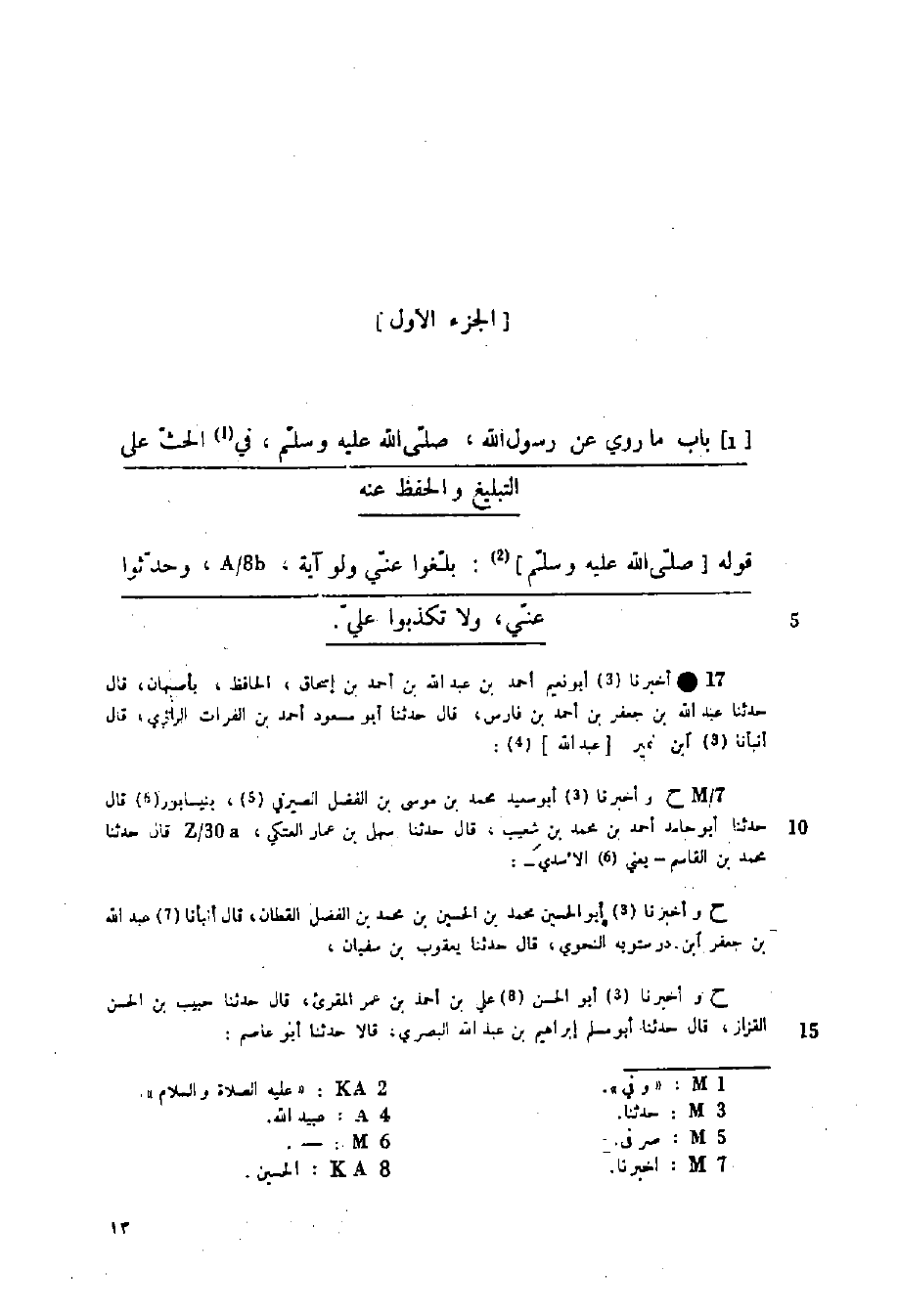 أَخْبَرَنَا أَبُو نُعَيْمٍ أَحْمَدُ بْنُ عَبْدِ اللَّهِ بْنِ أَحْمَدَ بْنِ إِسْحَاقَ الْحَافِظُ بِأَصْبَهَانَ، قَالَ: حَدَّثَنَا عَبْدُ اللَّهِ بْنُ جَعْفَرِ بْنِ أَحْمَدَ بْنِ فَارِسٍ، قَالَ حَدَّثَنَا أَبُو مَسْعُودٍ أَحْمَدُ بْنُ الْفُرَاتِ الرَّازِيُّ، قَالَ: أَخْبَرَنَا ابْنُ نُمَيْرٍ عَبْدُ اللَّهِ: ح وَأَخْبَرَنَا أَبُو سَعِيدٍ مُحَمَّدُ بْنُ مُوسَى بْنِ الْفَضْلِ الصَّيْرَفِيُّ بِنَيْسَابُورَ قَالَ: حَدَّثَنَا أَبُو حَامِدٍ أَحْمَدُ بْنُ مُحَمَّدِ بْنِ شُعَيْبٍ، قَالَ: حَدَّثَنَا سَهْلُ بْنُ عَمَّارٍ الْعَتَكِيُّ، قَالَ: حَدَّثَنَا مُحَمَّدُ بْنُ الْقَاسِمِ يَعْنِي الْأَسَدِيَّ: ح وَأَخْبَرَنَا أَبُو الْحُسَيْنِ مُحَمَّدُ بْنُ الْحُسَيْنِ بْنِ مُحَمَّدِ بْنِ الْفَضْلِ الْقَطَّانُ، قَالَ: أَنْبَأَنَا عَبْدُ اللَّهِ بْنُ جَعْفَرِ بْنِ دُرُسْتَوَيْهِ النَّحْوِيُّ، قَالَ حَدَّثَنَا يَعْقُوبُ بْنُ سُفْيَانَ، ح وَأَخْبَرَنَا أَبُو الْحَسَنِ عَلِيُّ بْنُ أَحْمَدَ بْنِ عُمَرَ الْمُقْرِئُ، قَالَ: حَدَّثَنَا حَبِيبُ بْنُ الْحَسَنِ الْقَزَّازُ، قَالَ: حَدَّثَنَا أَبُو مُسْلِمٍ إِبْرَاهِيمُ بْنُ عَبْدِ اللَّهِ الْبَصْرِيُّ، قَالَا: حَدَّثَنَا أَبُو عَاصِمٍ ح -[14]-: وَأَخْبَرَنَا أَبُو الْقَاسِمِ عَلِيُّ بْنُ مُحَمَّدِ بْنِ عَلِيٍّ الْإِيَادِيُّ، قَالَ: أَخْبَرَنَا أَحْمَدُ بْنُ يُوسُفَ بْنِ خَلَّادٍ الْعَطَّارُ، قَالَ: حَدَّثَنَا الْحَارِثُ بْنُ مُحَمَّدٍ التَّمِيمِيُّ، قَالَ: حَدَّثَنَا عَاصِمُ بْنُ عَلِيٍّ، قَالَ: حَدَّثَنَا أَخِي، الْحَسَنُ بْنُ عَلِيٍّ: ح وَأَخْبَرَنَا الْقَاضِي أَبُو الْعَلَاءِ مُحَمَّدُ بْنُ عَلِيِّ بْنِ يَعْقُوبَ الْوَاسِطِيُّ، قَالَ: أَخْبَرَنَا أَحْمَدُ بْنُ جَعْفَرِ بْنِ حَمْدَانَ، قَالَ: حَدَّثَنَا بَشِيرُ بْنُ مُوسَى، قَالَ: حَدَّثَنَا مُعَاوِيَةُ بْنُ عَمْرٍو، عَنْ أَبِي إِسْحَاقَ يَعْنِي الْفَزَارِيَّ، كُلُّهُمْ عَنِ الْأَوْزَاعِيِّ ح وَأَخْبَرَنَا أَبُو الْحُسَيْنِ عَلِيُّ بْنُ مُحَمَّدِ بْنِ عَبْدِ اللَّهِ بْنِ بِشْرَانَ الْمُعَدِّلُ، قَالَ أَخْبَرَنَا أَبُو بَكْرٍ مُحَمَّدُ بْنُ جَعْفَرِ بْنِ مُحَمَّدٍ الْأَدَمِيُّ الْقَارِئُ، قَالَ: حَدَّثَنَا ابْنُ الطَّبَّاعِ، قَالَ: حَدَّثَنَا مُحَمَّدُ بْنُ مُصْعَبٍ،: وَأَخْبَرَنَا عَلِيُّ بْنُ عَلِيٍّ الْمُعَدِّلُ، قَالَ: أَخْبَرَنَا الْحَسَنُ بْنُ جَعْفَرِ بْنِ مُحَمَّدٍ السِّمْسَارُ، قَالَ: حَدَّثَنَا أَبُو شُعَيْبٍ الْحَرَّانِيُّ، قَالَ: حَدَّثَنِي يَحْيَى بْنُ عَبْدِ اللَّهِ،: وَأَخْبَرَنَا مُحَمَّدُ بْنُ عَلِيِّ بْنِ الْفَتْحِ الْحَرْبِيُّ، وَلَفْظُ الْخَبَرِ، لَهُ، قَالَ: أَنْبَأَنَا عُمَرُ بْنُ إِبْرَاهِيمَ الْمُقْرِئُ، قَالَ: أَخْبَرَنَا عَبْدُ اللَّهِ بْنُ مُحَمَّدِ بْنِ عَبْدِ الْعَزِيزِ، قَالَ: حَدَّثَنَا أَبُو خَيْثَمَةَ، قَالَ: حَدَّثَنَا الْوَلِيدُ بْنُ مُسْلِمٍ، قَالَ: حَدَّثَنَا الْأَوْزَاعِيُّ، حَدَّثَنِي حَسَّانُ بْنُ عَطِيَّةَ، قَالَ: حَدَّثَنِي أَبُو كَبْشَةَ، أَنَّ عَبْدَ اللَّهِ بْنَ عَمْرٍو حَدَّثَهُ أَنَّهُ، سَمِعَ رَسُولَ اللَّهِ صَلَّى اللهُ عَلَيْهِ وَسَلَّمَ يَقُولُ: «§بَلِّغُوا عَنِّي وَلَوْ آيَةً، وَحَدِّثُوا عَنْ بَنِي إِسْرَائِيلَ وَلَا حَرَجَ، وَمَنْ كَذَبَ عَلَيَّ مُتَعَمِّدًا فَلْيَتَبَوَّأْ مَقْعَدَهُ مِنَ النَّارِ» . وَأَلْفَاظُهُمْ عَلَى الْمَتْنِ سَوَاءٌ قَالَ أَبُو بَكْرٍ: هَكَذَا رَوَاهُ عَبْدُ الرَّحْمَنِ بْنُ ثَابِتِ بْنِ ثَوْبَانَ عَنْ حَسَّانَ بْنِ عَطِيَّةَ