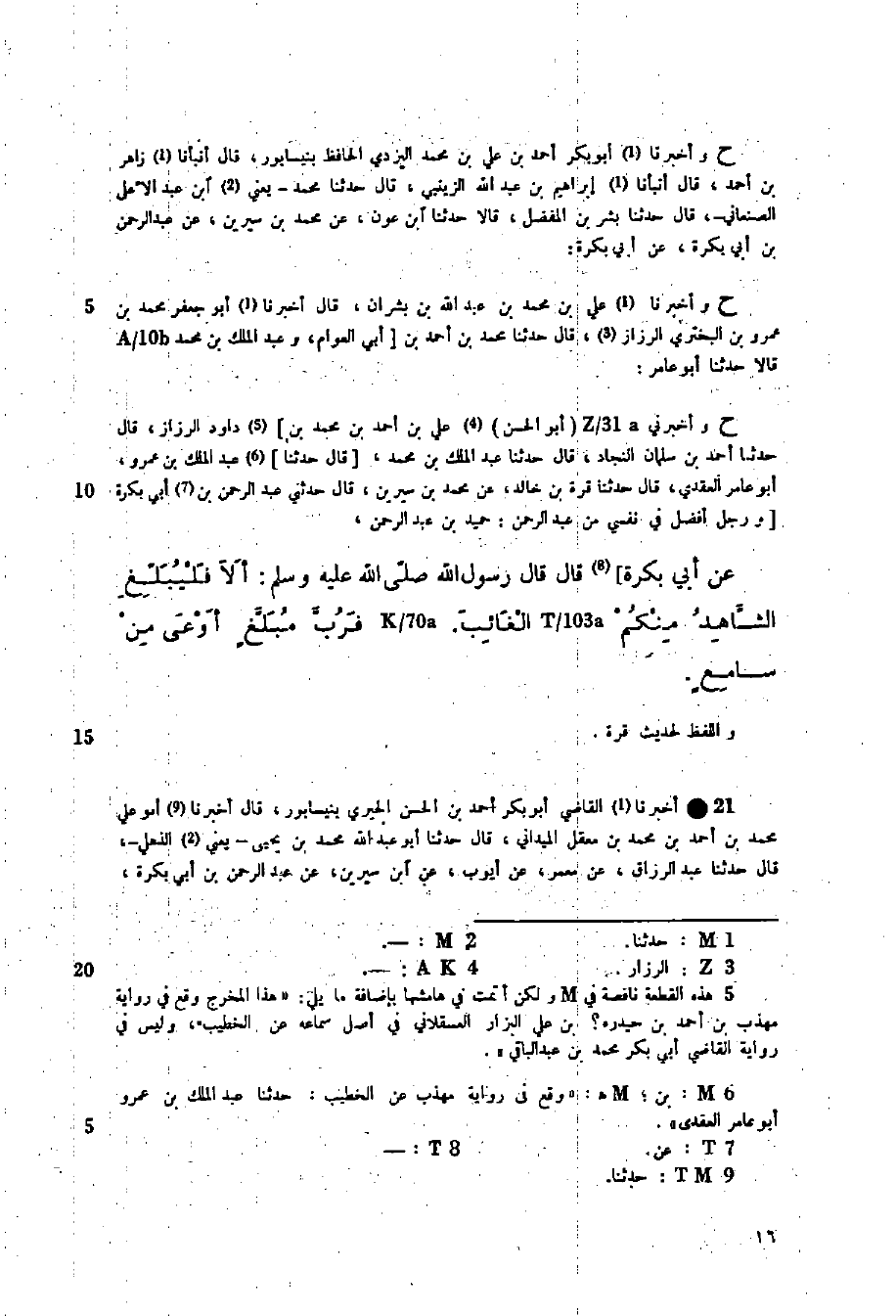أَخْبَرَنَا الْقَاضِي أَبُو بَكْرٍ أَحْمَدُ بْنُ الْحَسَنِ الْجِيرِيُّ بِنَيْسَابُورَ، قَالَ: أَخْبَرَنَا أَبُو عَلِيٍّ مُحَمَّدُ بْنُ أَحْمَدَ بْنِ مُحَمَّدِ بْنِ مَعْقِلٍ الْمَيْدَانِيُّ، قَالَ: حَدَّثَنَا أَبُو عَبْدِ اللَّهِ مُحَمَّدُ بْنُ يَحْيَى يَعْنِي الذُّهْلِيَّ، قَالَ: حَدَّثَنَا عَبْدُ الرَّزَّاقِ، عَنْ مَعْمَرٍ، عَنْ أَيُّوبَ، عَنِ ابْنِ سِيرِينَ، عَنْ عَبْدِ الرَّحْمَنِ بْنِ أَبِي بَكْرَةَ -[17]-، عَنْ أَبِيهِ، أَنَّ النَّبِيَّ صَلَّى اللهُ عَلَيْهِ وَسَلَّمَ قَالَ فِي حَجَّةِ الْوَدَاعِ: §«لِيُبَلِّغْ شَاهِدُكُمْ غَائِبَكُمْ. فَرُبَّ مُبَلَّغٍ أَحْفَظُ مِنْ سَامِعٍ» .