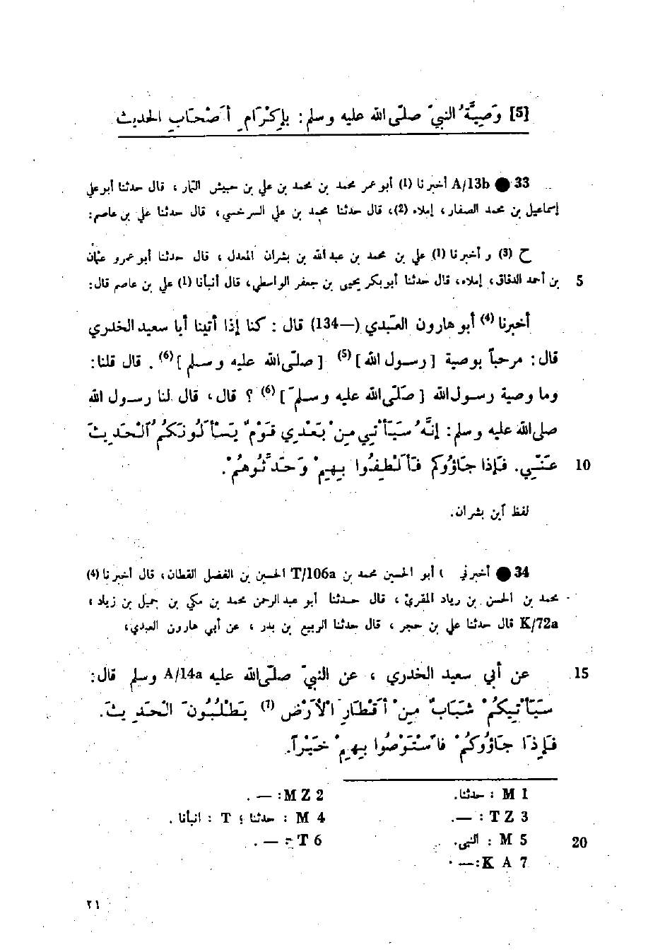 أَخْبَرَنَا أَبُو عُمَرَ مُحَمَّدُ بْنُ مُحَمَّدِ بْنِ عَلِيِّ بْنِ حُبَيْشٍ التَّمَّارُ، قَالَ: حَدَّثَنَا أَبُو عَلِيٍّ إِسْمَاعِيلُ بْنُ مُحَمَّدٍ الصَّفَّارُ إِمْلَاءً، قَالَ: حَدَّثَنَا مُحَمَّدُ بْنُ عَلِيٍّ السَّرَخْسِيُّ، قَالَ: حَدَّثَنَا عَلِيُّ بْنُ عَاصِمٍ ح: وَأَخْبَرَنَا عَلِيُّ بْنُ مُحَمَّدِ بْنِ عَبْدِ اللَّهِ بْنِ بِشْرَانَ الْمُعَدِّلُ، قَالَ: حَدَّثَنَا أَبُو عَمْرٍو عُثْمَانُ بْنُ أَحْمَدَ الدَّقَّاقُ، إِمْلَاءً، قَالَ: حَدَّثَنَا أَبُو بَكْرٍ يَحْيَى بْنُ جَعْفَرٍ الْوَاسِطِيُّ، قَالَ: أنبأنا عَلِيُّ بْنُ عَاصِمٍ، قَالَ: أَخْبَرَنَا أَبُو هَارُونَ الْعَبْدِيُّ، قَالَ: كُنَّا إِذَا أَتَيْنَا أَبَا سَعِيدٍ الْخُدْرِيَّ قَالَ: مَرْحَبًا بِوَصِيَّةِ رَسُولِ اللَّهِ صَلَّى اللهُ عَلَيْهِ وَسَلَّمَ. قَالَ: قُلْنَا: وَمَا وَصِيَّةُ رَسُولِ اللَّهِ صَلَّى اللهُ عَلَيْهِ وَسَلَّمَ؟ قَالَ: قَالَ لَنَا رَسُولُ اللَّهِ صَلَّى اللهُ عَلَيْهِ وَسَلَّمَ: §«إِنَّهُ سَيَأْتِي مِنْ بَعْدِي قَوْمٌ يَسْأَلُونَكُمُ الْحَدِيثَ عَنِّي. فَإِذَا جَاءُوكُمْ، فَأَلْطِفُوا بِهِمْ وَحَدِّثُوهُمْ» لَفْظُ ابْنِ بِشْرَانَ