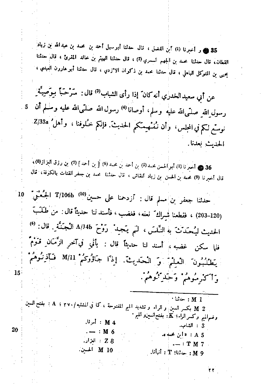 وَأَخْبَرَنَا ابْنُ الْفَضْلِ، قَالَ: حَدَّثَنَا أَبُو سَهْلٍ أَحْمَدُ بْنُ مُحَمَّدِ بْنِ عَبْدِ اللَّهِ بْنِ زِيَادٍ الْقَطَّانُ، قَالَ: حَدَّثَنَا مُحَمَّدُ بْنُ الْجَهْمِ السِّمَرِيُّ، قَالَ: حَدَّثَنَا الْهَيْثَمُ بْنُ خَالِدٍ الْمُقْرِئُ، قَالَ: حَدَّثَنَا يَحْيَى بْنُ الْمُتَوَكِّلِ الْبَاهِلِيُّ، قَالَ: حَدَّثَنَا مُحَمَّدُ بْنُ ذَكْوَانَ الْأَزْدِيُّ، قَالَ: حَدَّثَنَا أَبُو هَارُونَ الْعَبْدِيُّ، عَنْ أَبِي سَعِيدٍ الْخُدْرِيِّ، أَنَّهُ كَانَ إِذَا رَأَى الشَّبَابَ قَالَ: مَرْحَبًا بِوَصِيَّةِ رَسُولِ اللَّهِ صَلَّى اللهُ عَلَيْهِ وَسَلَّمَ، أَوْصَانَا رَسُولُ اللَّهِ صَلَّى اللهُ عَلَيْهِ وَسَلَّمَ أَنْ §نُوَسِّعَ لَكُمْ فِي الْمَجْلِسِ، وَأَنْ نُفْهِمَكُمُ الْحَدِيثَ. فَإِنَّكُمْ خَلُوفُنَا، وَأَهْلُ الْحَدِيثِ بَعْدَنَا