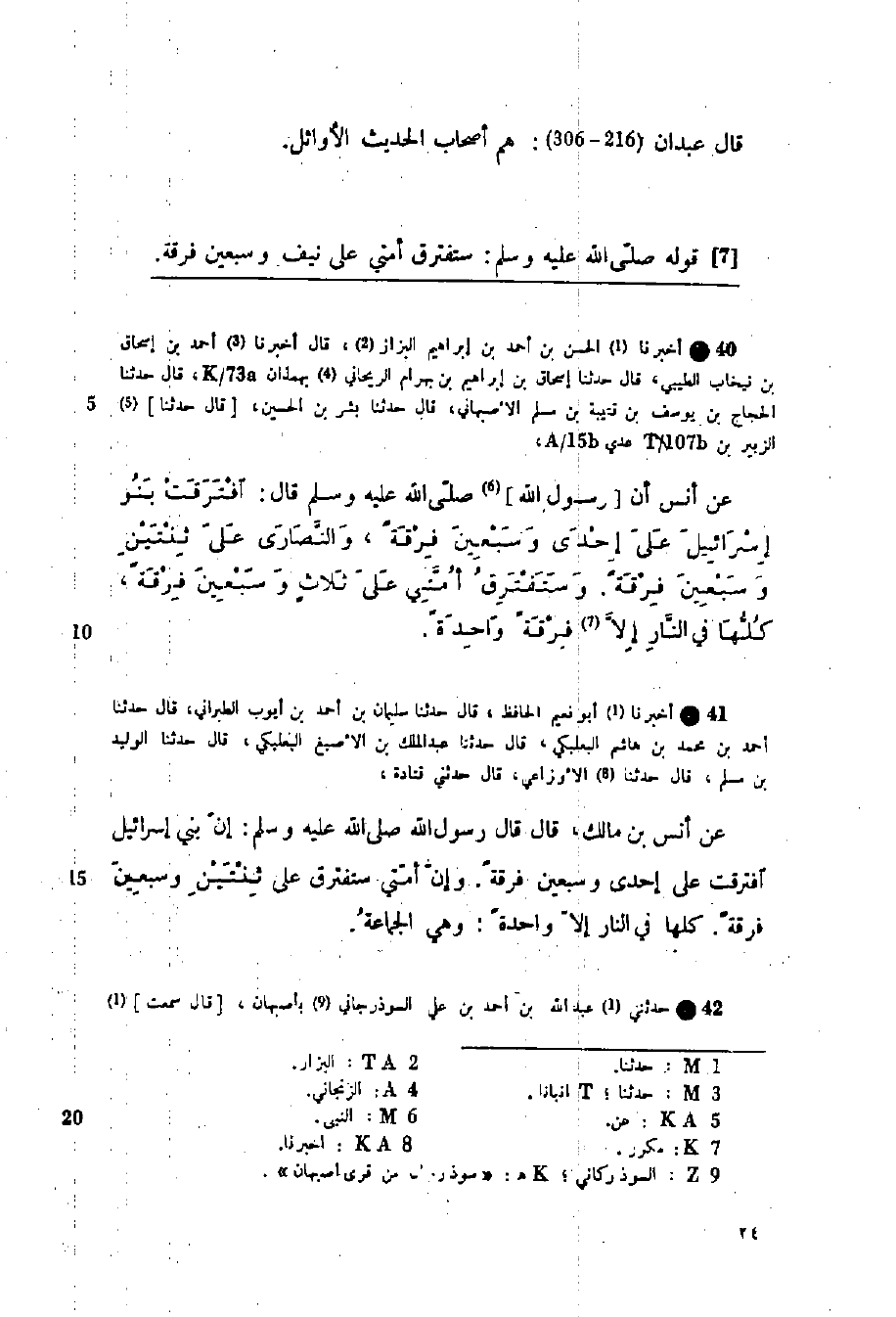 حَدَّثَنِي عَبْدُ اللَّهِ بْنُ أَحْمَدَ بْنِ عَلِيٍّ السُّوذَرْجَانِيُّ، بِأَصْبَهَانَ، قَالَ سَمِعْتُ -[25]- عَبْدَ اللَّهِ بْنَ أَبِي الْقَاسِمِ، يَقُولُ سَمِعْتُ أَحْمَدَ بْنَ مُحَمَّدِ بْنِ رَوَهٍ، يَقُولُ: حَدَّثَنَا إِبْرَاهِيمُ بْنُ مُحَمَّدِ بْنِ الْحَسَنِ، قَالَ: حُدِّثْتُ عَنْ أَحْمَدَ بْنِ حَنْبَلٍ، وَذَكَرَ، حَدِيثَ النَّبِيِّ صَلَّى اللهُ عَلَيْهِ وَسَلَّمَ: «§تَفْتَرِقُ الْأُمَّةُ عَلَى نَيِّفٍ وَسَبْعِينَ فِرْقَةً، كُلُّهَا فِي النَّارِ إِلَّا فِرْقَةً» ، فَقَالَ: إِنْ لَمْ يَكُونُوا أَصْحَابَ الْحَدِيثِ، فَلَا أَدْرِي مَنْ هُمْ