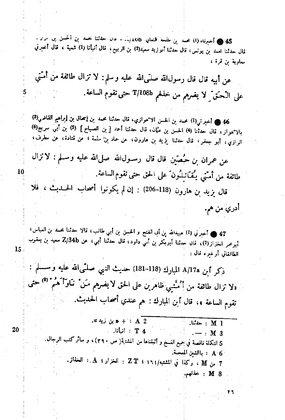 أَخْبَرَنِي مُحَمَّدُ بْنُ الْحَسَنِ الْأَهْوَازِيُّ، قَالَ: حَدَّثَنَا مُحَمَّدُ بْنُ إِسْحَاقَ بْنِ إِبْرَاهِيمَ الْقَاضِي، بِالْأَهْوَازِ، قَالَ: حَدَّثَنَا الْحَسَنُ بْنُ عُثْمَانَ، قَالَ: حَدَّثَنَا أَحْمَدُ بْنُ الصَّبَّاحِ بْنِ أَبِي سُرَيْجٍ الرَّازِيُّ أَبُو جَعْفَرٍ، قَالَ: حَدَّثَنَا يَزِيدُ بْنُ هَارُونَ، عَنْ حَمَّادِ بْنِ سَلَمَةَ، عَنْ قَتَادَةَ، عَنْ مُطَرِّفٍ، عَنْ عِمْرَانَ بْنِ حُصَيْنٍ، قَالَ: قَالَ رَسُولُ اللَّهِ صَلَّى اللهُ عَلَيْهِ وَسَلَّمَ: §«لَا تَزَالُ طَائِفَةٌ مِنْ أُمَّتِي يُقَاتِلُونَ عَلَى الْحَقِّ حَتَّى تَقُومَ السَّاعَةُ» . قَالَ يَزِيدُ بْنُ هَارُونَ: إِنْ لَمْ يَكُونُوا أَصْحَابَ الْحَدِيثِ، فَلَا أَدْرِي مَنْ هُمْ