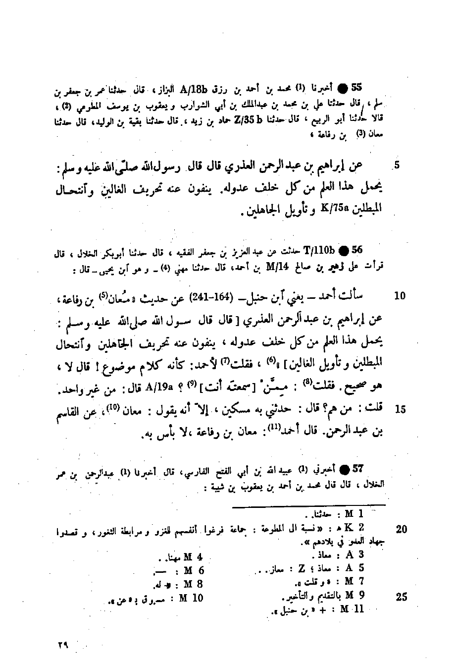 حُدِّثْتُ عَنْ عَبْدِ الْعَزِيزِ بْنِ جَعْفَرٍ الْفَقِيهُ، قَالَ: حَدَّثَنَا أَبُو بَكْرٍ الْخَلَّالُ، قَالَ: قَرَأْتُ عَلَى زُهَيْرِ بْنِ صَالِحِ بْنِ أَحْمَدَ، قَالَ: حَدَّثَنَا مُهَنِّيٌّ وَهُوَ ابْنُ يَحْيَى قَالَ: سَأَلْتُ أَحْمَدَ يَعْنِي ابْنَ حَنْبَلٍ عَنْ حَدِيثِ مُعَانِ بْنِ رِفَاعَةَ عَنْ إِبْرَاهِيمَ بْنِ عَبْدِ الرَّحْمَنِ الْعُذْرِيِّ، قَالَ: قَالَ رَسُولُ اللَّهِ صَلَّى اللهُ عَلَيْهِ وَسَلَّمَ: §«يَحْمِلُ هَذَا الْعِلْمَ مِنْ كُلِّ خَلَفٍ عُدُولُهُ يَنْفُونَ عَنْهُ تَحْرِيفَ الْجَاهِلِينَ وَانْتِحَالَ الْمُبْطِلِينَ وَتَأْوِيلَ الْغَالِينَ» فَقُلْتُ لِأَحْمَدَ: كَأَنَّهُ كَلَامٌ مَوْضُوعٌ قَالَ: لَا، هُوَ صَحِيحٌ. فَقُلْتُ: مِمَّنْ سَمِعْتَهُ أَنْتَ؟ قَالَ: مِنْ غَيْرِ وَاحِدٍ. قُلْتُ: مَنْ هُمْ؟ قَالَ: حَدَّثَنِي بِهِ مِسْكِينٌ، إِلَّا أَنَّهُ يَقُولُ: مُعَانٌ، عَنِ الْقَاسِمِ بْنِ عَبْدِ الرَّحْمَنِ. قَالَ أَحْمَدُ: مُعَانُ بْنُ رِفَاعَةَ، لَا بَأْسَ بِهِ