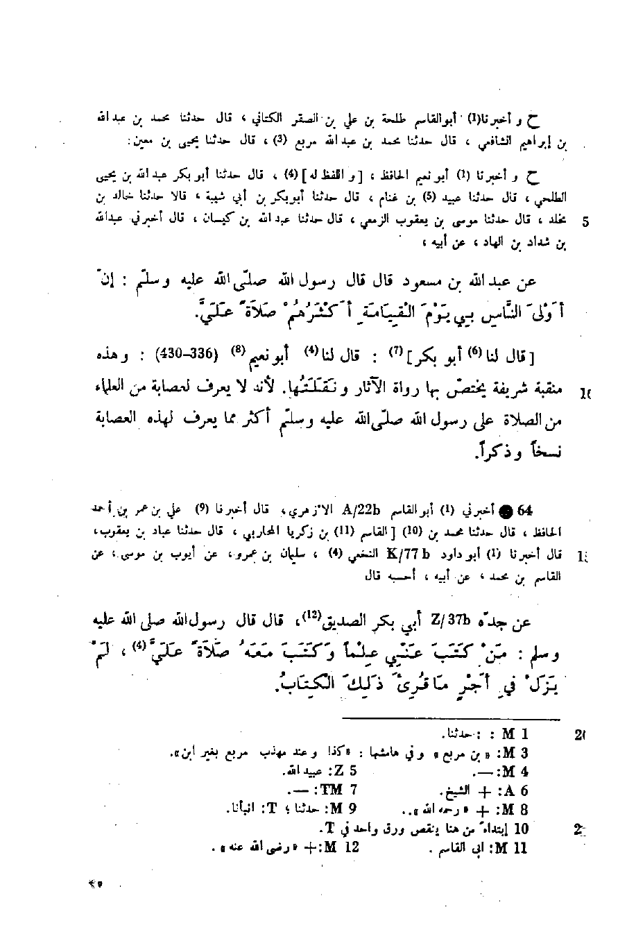 أَخْبَرَنِي أَبُو الْقَاسِمِ الْأَزْهَرِيُّ، قَالَ: أَخْبَرَنَا عَلِيُّ بْنُ عُمَرَ بْنِ أَحْمَدَ الْحَافِظُ، قَالَ: حَدَّثَنَا مُحَمَّدُ بْنُ الْقَاسِمِ بْنِ زَكَرِيَّا الْمُحَارِبِيُّ، قَالَ: حَدَّثَنَا عَبَّادُ بْنُ يَعْقُوبَ، قَالَ: أَخْبَرَنَا أَبُو دَاوُدَ النَّخَعِيُّ سُلَيْمَانُ بْنُ عَمْرٍو، عَنْ أَيُّوبَ بْنِ مُوسَى، عَنِ الْقَاسِمِ بْنِ مُحَمَّدٍ، عَنْ أَبِيهِ، أَحْسِبُهُ قَالَ: عَنْ جَدِّهِ أَبِي بَكْرٍ الصِّدِّيقِ، قَالَ: قَالَ رَسُولُ اللَّهِ صَلَّى اللهُ عَلَيْهِ وَسَلَّمَ: «§مَنْ كَتَبَ عَنِّي عِلْمًا وَكَتَبَ مَعَهُ صَلَاةً عَلَيَّ، لَمْ يَزَلْ فِي أَجْرٍ مَا قُرِئَ ذَلِكَ الْكِتَابُ»
