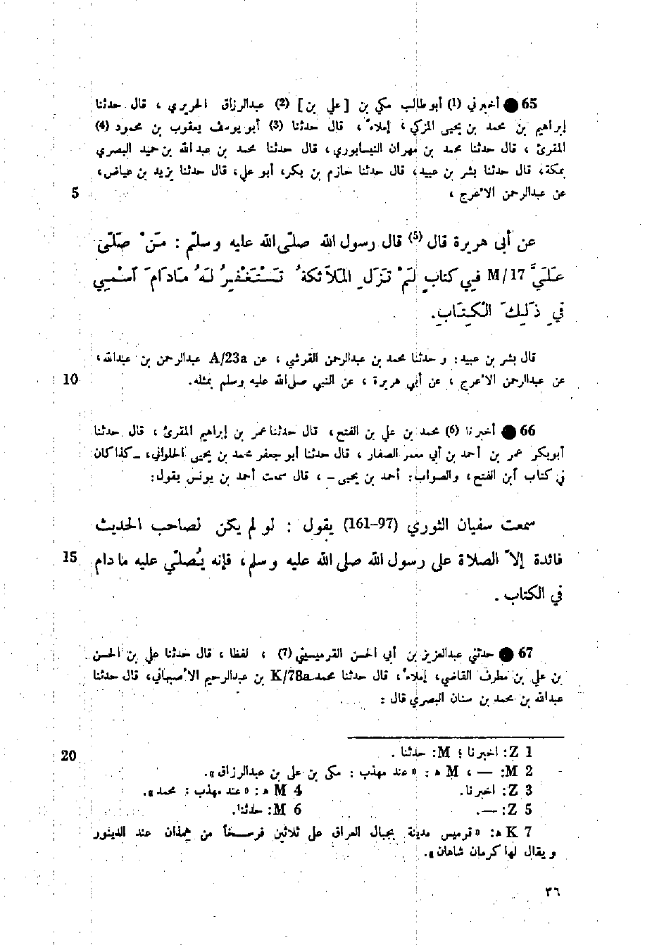 أَخْبَرَنِي أَبُو طَالِبٍ مَكِّيُّ بْنُ عَلِيِّ بْنِ عَبْدِ الرَّزَّاقِ الْحَرِيرِيُّ، قَالَ: حَدَّثَنَا إِبْرَاهِيمُ بْنُ مُحَمَّدِ بْنِ يَحْيَى الْمُزَكِّي، إِمْلَاءً، قَالَ: حَدَّثَنَا أَبُو يُوسُفَ يَعْقُوبُ بْنُ مَحْمُودٍ الْمُقْرِئُ، قَالَ: حَدَّثَنَا مُحَمَّدُ بْنُ مِهْرَانَ النَّيْسَابُورِيُّ، قَالَ: حَدَّثَنَا مُحَمَّدُ بْنُ عَبْدِ اللَّهِ بْنِ حُمَيْدٍ الْبَصْرِيُّ، بِمَكَّةَ، قَالَ: حَدَّثَنَا بِشْرُ بْنُ عُبَيْدٍ، قَالَ: حَدَّثَنَا حَازِمُ بْنُ بَكْرٍ أَبُو عَلِيٍّ، قَالَ: حَدَّثَنَا يَزِيدُ بْنُ عِيَاضٍ، عَنْ عَبْدِ الرَّحْمَنِ الْأَعْرَجِ، عَنْ أَبِي هُرَيْرَةَ، قَالَ: قَالَ رَسُولُ اللَّهِ صَلَّى اللهُ عَلَيْهِ وَسَلَّمَ: §«مَنْ صَلَّى عَلَيَّ فِي كِتَابٍ لَمْ تَزَلِ الْمَلَائِكَةُ تَسْتَغْفِرُ لَهُ مَادَامَ اسْمِي فِي ذَلِكَ الْكِتَابِ» . قَالَ بِشْرُ بْنُ عُبَيْدٍ: وَحَدَّثَنَا مُحَمَّدُ بْنُ عَبْدِ الرَّحْمَنِ الْقُرَشِيُّ، عَنْ عَبْدِ الرَّحْمَنِ بْنِ عَبْدِ اللَّهِ، عَنْ عَبْدِ الرَّحْمَنِ الْأَعْرَجِ، عَنْ أَبِي هُرَيْرَةَ، عَنِ النَّبِيِّ صَلَّى اللهُ عَلَيْهِ وَسَلَّمَ بِمِثْلِهِ