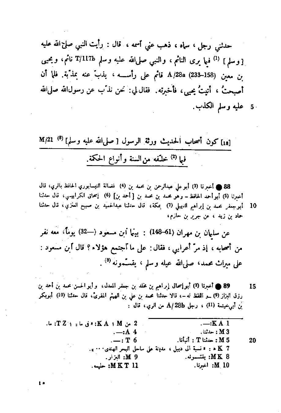 أَخْبَرَنَا أَبُو عَلِيٍّ عَبْدُ الرَّحْمَنِ بْنُ مُحَمَّدِ بْنِ فَضَالَةَ النَّيْسَابُورِيُّ الْحَافِظُ، بِالرِّيِّ، قَالَ: أَخْبَرَنَا أَبُو أَحْمَدَ الْحَافِظُ وَهُوَ مُحَمَّدُ بْنُ مُحَمَّدِ بْنِ أَحْمَدَ بْنِ إِسْحَاقَ الْكَرَابِيسِيُّ، قَالَ: حَدَّثَنَا أَبُو جَعْفَرٍ مُحَمَّدُ بْنُ إِبْرَاهِيمَ الدِّيبِلِيُّ بِمَكَّةَ، قَالَ: حَدَّثَنَا عَبْدُ الْحَمِيدِ بْنُ صُبَيْحٍ الْعَنَزِيُّ، قَالَ: حَدَّثَنَا حَمَّادُ بْنُ زَيْدٍ، عَنْ جَرِيرِ بْنِ حَازِمٍ، عَنْ سُلَيْمَانَ بْنِ مِهْرَانَ،: بَيْنَمَا ابْنُ مَسْعُودٍ يَوْمًا، مَعَهُ نَفَرٌ مِنْ أَصْحَابِهِ، إِذْ مَرَّ أَعْرَابِيٌّ، فَقَالَ: عَلَى مَا اجْتَمَعَ هَؤُلَاءِ؟ قَالَ: ابْنُ مَسْعُودٍ: «§عَلَى مِيرَاثِ مُحَمَّدٍ، صَلَّى اللهُ عَلَيْهِ وَسَلَّمَ يَقْتَسِمُونَهُ»