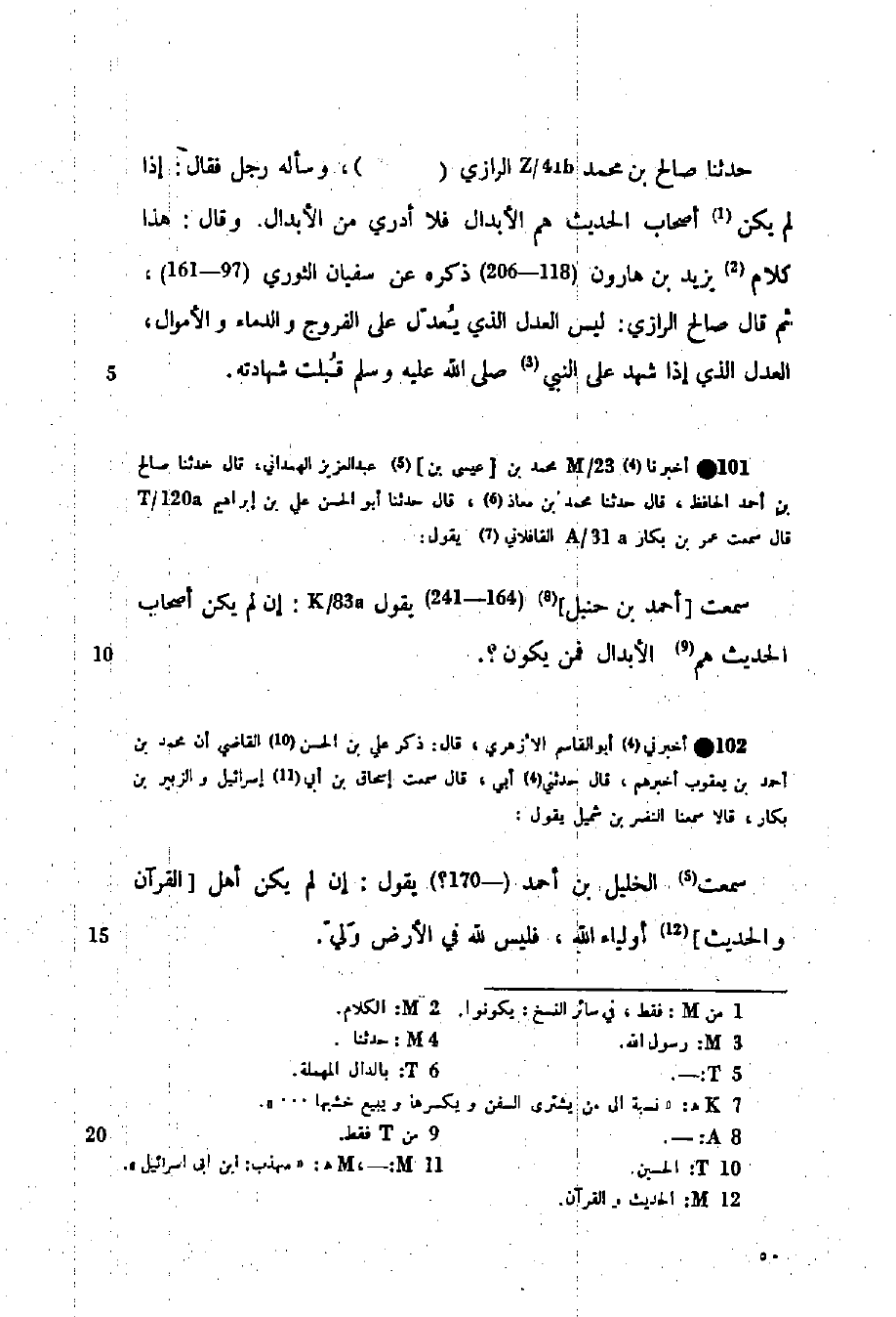 أَخْبَرَنَا مُحَمَّدُ بْنُ عِيسَى بْنِ عَبْدِ الْعَزِيزِ الْهَمْدَانِيُّ، قَالَ: حَدَّثَنَا صَالِحُ بْنُ أَحْمَدَ الْحَافِظُ، قَالَ: حَدَّثَنَا مُحَمَّدُ بْنُ مُعَاذٍ، قَالَ: حَدَّثَنَا أَبُو الْحَسَنِ عَلِيُّ بْنُ إِبْرَاهِيمَ قَالَ: سَمِعْتُ عُمَرَ بْنَ بَكَّارٍ الْقَافْلَانِيَّ، يَقُولُ سَمِعْتُ أَحْمَدَ بْنَ حَنْبَلٍ، يَقُولُ: §«إِنْ لَمْ يَكُنْ أَصْحَابُ الْحَدِيثِ هُمُ الْأَبْدَالُ فَمَنْ يَكُونُ»