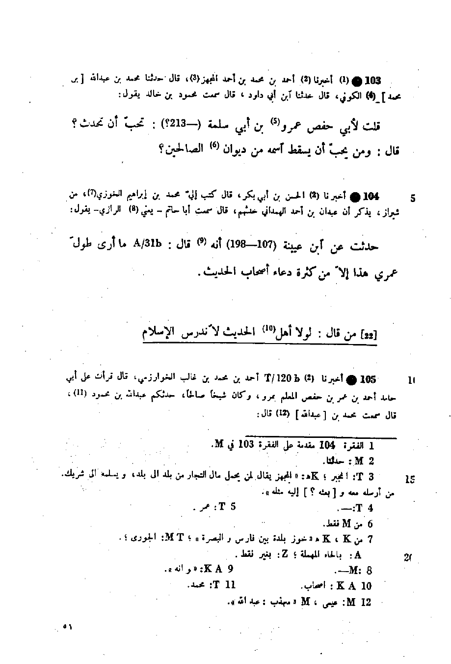 أَخْبَرَنَا أَحْمَدُ بْنُ مُحَمَّدِ بْنِ أَحْمَدَ الْمُجْهِزُ، قَالَ: حَدَّثَنَا مُحَمَّدُ بْنُ عَبْدِ اللَّهِ بْنِ مُحَمَّدٍ الْكُوفِيُّ، قَالَ: حَدَّثَنَا ابْنُ أَبِي دَاوُدَ، قَالَ: سَمِعْتُ مَحْمُودَ بْنَ خَالِدٍ، يَقُولُ: قُلْتُ لِأَبِي حَفْصٍ عَمْرِو بْنِ أَبِي سَلَمَةَ: تُحِبُّ أَنْ تُحَدِّثَ،؟ قَالَ: §«وَمَنْ يُحِبُّ أَنْ يَسْقُطَ اسْمُهُ مِنْ دِيوَانِ الصَّالِحِينَ؟»