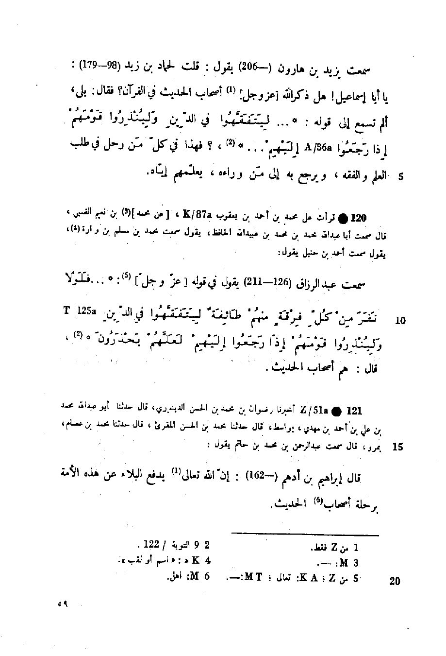 قَرَأْتُ عَلَى مُحَمَّدِ بْنِ أَحْمَدَ بْنِ يَعْقُوبَ، عَنْ مُحَمَّدِ بْنِ نُعَيْمٍ الضَّبِّيِّ، قَالَ: سَمِعْتُ أَبَا عَبْدِ اللَّهِ مُحَمَّدَ بْنَ مُحَمَّدِ بْنِ عُبَيْدِ اللَّهِ الْحَافِظَ، يَقُولُ سَمِعْتُ مُحَمَّدَ بْنَ مُسْلِمِ بْنِ وَارَةَ، يَقُولُ: سَمِعْتُ أَحْمَدَ بْنَ حَنْبَلٍ، يَقُولُ سَمِعْتُ عَبْدَ الرَّزَّاقِ، يَقُولُ فِي قَوْلِهِ عَزَّ وَجَلَّ: {فَلَوْلَا نَفَرَ مِنْ كُلِّ فِرْقَةٍ مِنْهُمْ طَائِفَةٌ لِيَتَفَقَّهُوا فِي الدِّينِ وَلِيُنْذِرُوا قَوْمَهُمْ إِذَا رَجَعُوا إِلَيْهِمْ لَعَلَّهُمْ يَحْذَرُونَ} [التوبة: 122] ، قَالَ: §«هُمْ أَصْحَابُ الْحَدِيثِ»
