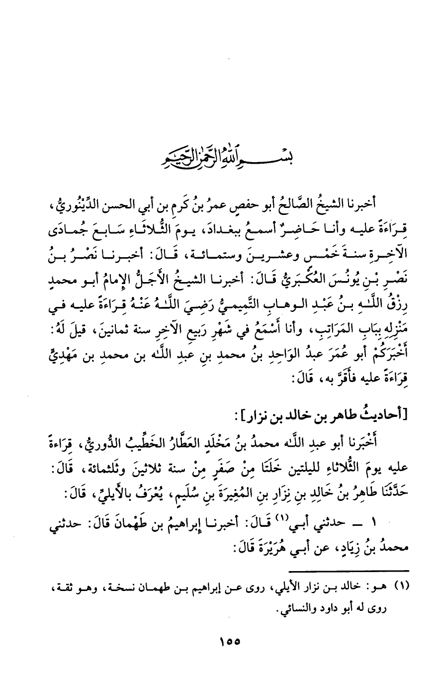 أخبرنا أَبُو عَبْدِ اللَّهِ مُحَمَّدُ بْنُ مَخْلَدٍ الْعَطَّارُ الخطيب الدوري قراءة عليه يوم الثلاثاء لليلتين خلتا من صفر من سنة ثلاثين وثلثمائة قال حدثنا طاهر بن خالد بن نزار بن المغيرة بن سليم يعرف بالأيلي قال