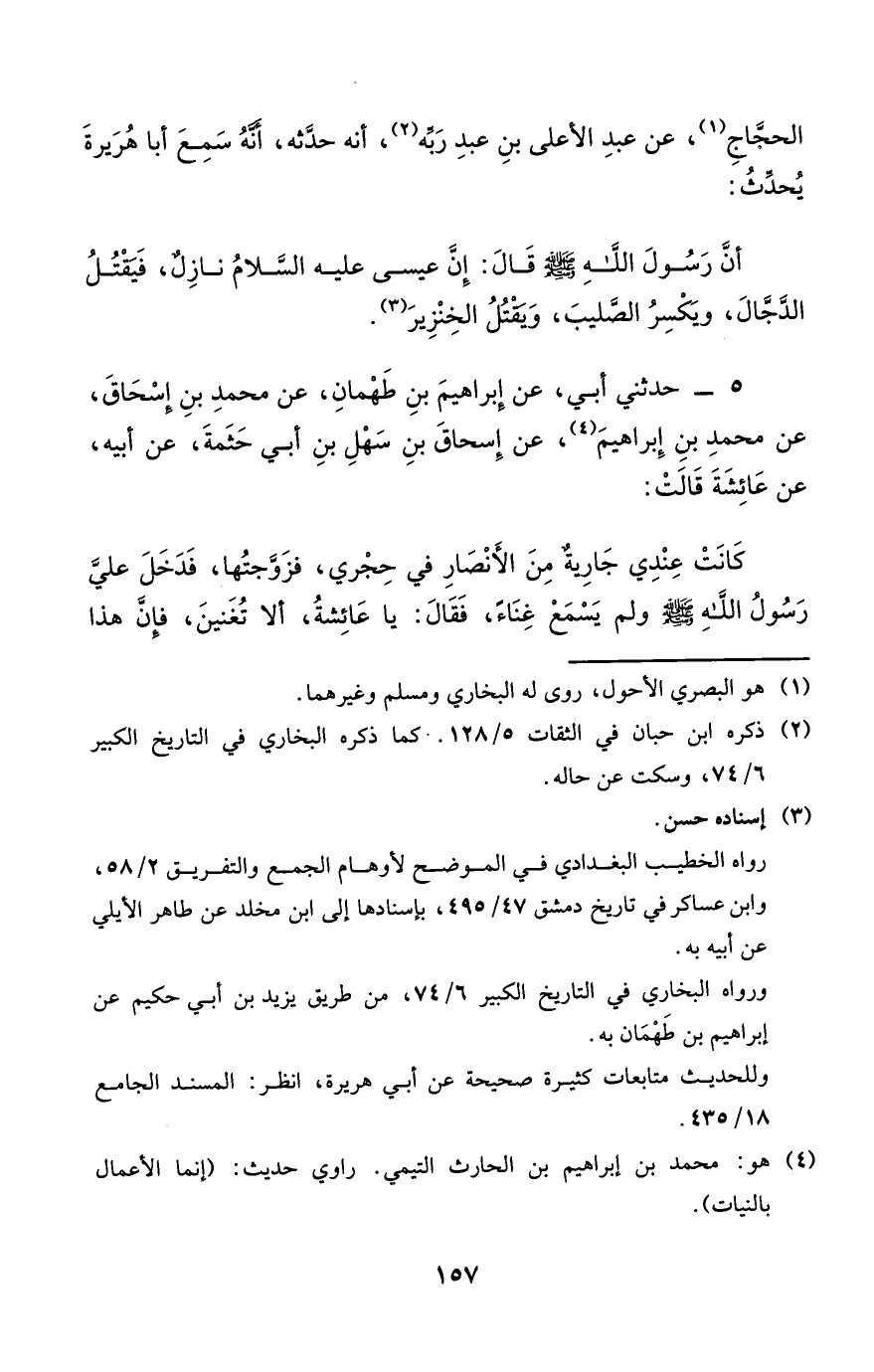 5 - حَدَّثَنِي أَبِي عَنْ إِبْرَاهِيمَ بْنِ طَهْمَانَ عَنْ مُحَمَّدِ بْنِ إِسْحَاقَ عَنْ مُحَمَّدِ بْنِ إِبْرَاهِيمَ عَنْ إِسْحَاقَ بْنِ سَهْلِ بْنِ أَبِي حَثَمَةَ عَنْ أَبِيهِ عَنْ عَائِشَةَ قَالَتْ كَانَتْ عِنْدِي جَارِيَةٌ مِنَ الأَنْصَارِ فِي حِجْرِي فَزَوَّجْتُهَا فَدَخَلَ علي رَسُول اللَّه صَلَّى اللَّهُ عَلَيْهِ وسلم وَلَمْ يَسْمَعْ غِنَاءً فَقَالَ يَا عَائِشَةُ أَلا تُغَنِّينَ فَإِنَّ هَذَا -[158]- الْحَيَّ مِنَ الأَنْصَارِ يُحِبُّونَ الغناء.