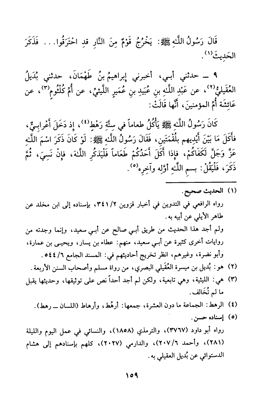 9 - حَدَّثَنِي أَبِي أَخْبَرَنِي إِبْرَاهِيمُ بْنُ طَهْمَانَ حَدَّثَنِي بُدَيْلُ الْعُقَيْلِيُّ عَنْ عَبْدِ اللَّهِ بْنِ عُبَيْدِ بْنِ عُمَيْرٍ اللَّيْثِيِّ عَنْ أُمِّ كُلْثُومٍ عَنْ عَائِشَةَ أُمِّ الْمُؤْمِنِينَ أَنَّهَا قَالَتْ كَانَ رَسُولُ اللَّهِ صَلَّى اللَّهُ عَلَيْهِ وَسَلَّمَ يَأْكُلُ طَعَامًا فِي سِتَّةِ رَهْطٍ إِذْ دَخَلَ أَعْرَابِيٌّ فَأَكَلَ مَا بَيْنَ أَيْدِيهِمْ بِلُقْمَتَيْنِ فَقَالَ رَسُول اللَّه صَلَّى اللَّهُ عَلَيْهِ وَسَلَّمَ لَوْ كَانَ ذَكَرَ اسْمَ اللَّهِ عَزَّ وَجَلَّ لَكَفَاكُمْ فَإِذَا أَكَلَ أَحَدُكُمْ طَعَامًا فَلْيَذْكُرِ اللَّهَ فَإِنَّ نَسِيَ ثُمَّ ذَكَرَ فَلْيَقُلْ بِسْمِ اللَّهِ أَوَّلَهُ وَآخِرَهُ.
