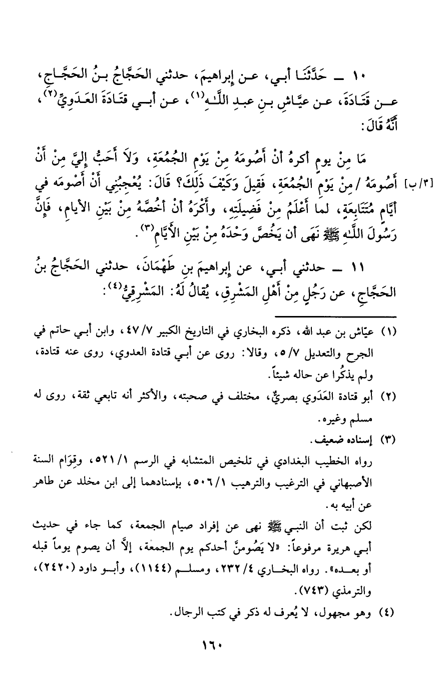 10 - حَدَّثَنَا أَبِي عَنْ إِبْرَاهِيمَ حَدَّثَنِي الْحَجَّاجُ بْنُ الْحَجَّاجِ عَنْ قَتَادَةَ عَنْ عَيَّاشِ بْنِ عَبْدِ اللَّهِ عَنْ أَبِي قَتَادَةَ الْعَدَوِيِّ أَنَّهُ قَالَ مَا مِنْ يَوْمٍ أَكْرَهُ أَنْ أَصُومَهُ مِنْ يَوْمِ الْجُمُعَةِ وَلا أَحَبُّ إِلَيَّ مِنْ أَنْ أَصُومَهُ مِنْ يَوْمِ الْجُمُعَةِ فَقِيلَ وَكَيْفَ ذَلِكَ قَالَ يُعْجِبُنِي أَنْ أَصُومَهُ فِي أَيَّامٍ مُتَتَابِعَةٍ لِمَا أَعْلَمُ مِنْ فَضِيلَتِهِ وَأَكْرَهُ أَنْ أَخُصَّهُ مِنْ بَيْنِ الأَيَّامِ فَإِنَّ رَسُول اللَّه صَلَّى اللَّهُ عَلَيْهِ وَسَلَّمَ نَهَى أَنْ يُخَصَّ وَحْدَهُ مِنْ بَيْنِ الأَيَّامِ.