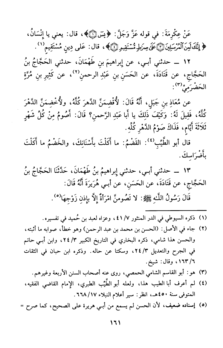 12 - حَدَّثَنِي أَبِي عَنْ إِبْرَاهِيمَ بْنِ طَهْمَانَ حَدَّثَنِي الْحَجَّاجُ بْنُ الْحَجَّاجِ عَنْ قَتَادَةَ عَنِ الْحَسَنِ بْنِ عَبْدِ الرَّحْمَنِ عَنْ كَثِيرِ بْنِ مُرَّةٍ الْحَضْرَمِيِّ عَنْ مُعَاذِ بْنِ جَبَلٍ أَنَّهُ قَالَ لأُقْضِمَنَّ الدَّهْرَ كُلَّهُ ولأُخْضِمَنَّ الدَّهْرَ كُلَّهُ فَقِيلَ لَهُ وَكَيْفَ ذَلِكَ يَا أَبَا عَبْدِ الرَّحْمَنِ قَالَ أَصُومُ مِنْ كُلِّ شَهْرٍ ثَلاثَةَ أَيَّامٍ فَذَاكَ صَوْمُ الدَّهْرِ كُلِّهِ. قَالَ أَبُو الطَّيِّبِ القَضْمُ مَا أَكَلْتَ بِأَسْنَانِكَ وَالخَضْمُ مَا أَكَلْتَ بأضراسك.