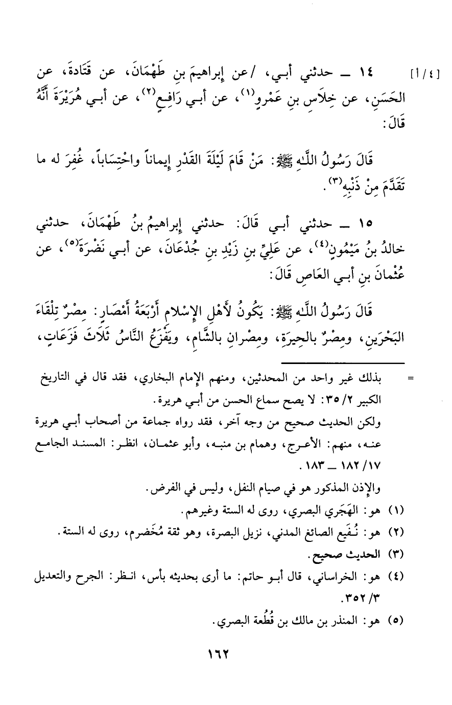 14 - حَدَّثَنِي أَبِي عَنْ إِبْرَاهِيمَ بْنِ طَهْمَانَ عَنْ قَتَادَةَ عَنِ الْحَسَنِ عَنْ خِلاسِ بْنِ عَمْرٍو عَنْ أَبِي رَافِعٍ عَنْ أَبِي هُرَيْرَةَ أَنَّهُ قَالَ قَالَ رَسُولُ اللَّهِ صَلَّى اللَّهُ عَلَيْهِ وَسَلَّمَ مِنْ قَامَ لَيْلَةَ الْقَدْرِ إِيمَانًا وَاحْتِسَابًا غُفِرَ لَهُ مَا تَقَدَّمَ مِنْ ذَنْبِهِ.