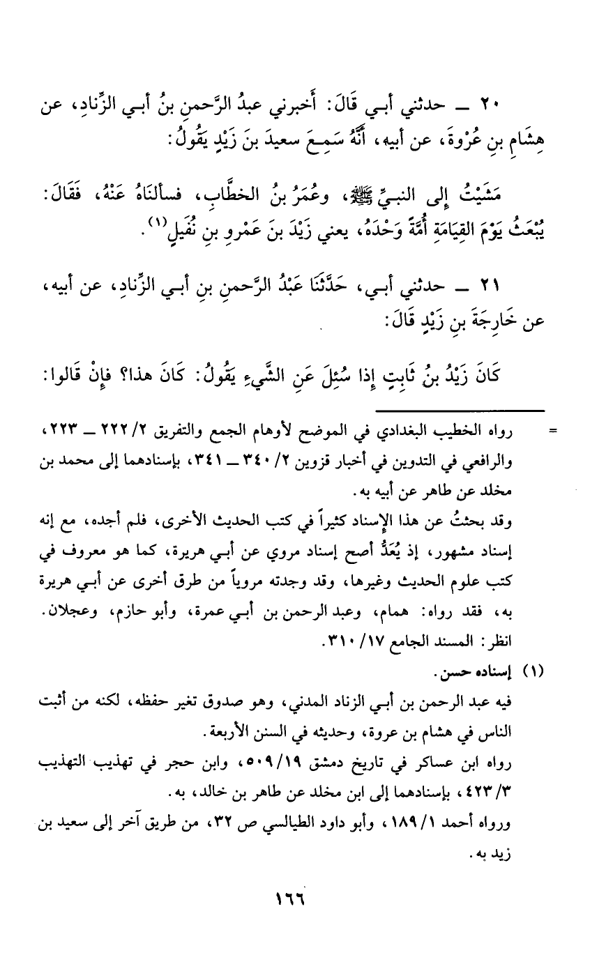 20 - حَدَّثَنِي أَبِي قَالَ أَخْبَرَنِي عَبْدُ الرَّحْمَنِ بْنُ أَبِي الزِّنَادِ عَنْ هِشَامِ بْنِ عُرْوَةَ عَنْ أَبِيهِ أَنَّهُ سَمِعَ سَعِيدَ بْنَ زَيْدٍ يَقُولُ مَشَيْتُ إِلَى النَّبِيَّ صَلَّى اللَّهُ عَلَيْهِ وَسَلَّمَ وَعُمَرُ بْنُ الْخَطَّابِ فَسَأَلْنَاهُ عَنْهُ فَقَالَ يُبْعَثُ يَوْمَ الْقِيَامَةِ أُمَّةً وَحْدَهُ يَعْنِي زَيْدَ بْنَ عَمْرٍو بْنِ نُفَيْلٍ.