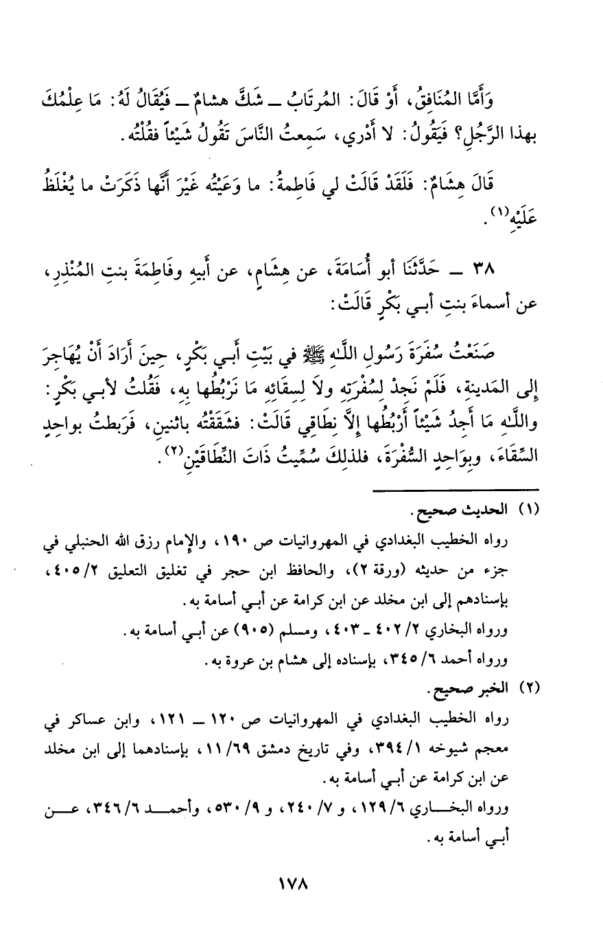 38 - حَدَّثَنَا أَبُو أُسَامَةَ عَنْ هِشَامٍ عَنْ أَبِيهِ وَفَاطِمَةَ بِنْتِ الْمُنْذِرِ عَنْ أَسْمَاءَ بِنْتِ أَبِي بَكْرٍ قَالَتْ صَنَعْتُ سُفَرَةَ رَسُول اللَّه صَلَّى اللَّهُ عَلَيْهِ وَسَلَّمَ فِي بَيْتِ أَبِي بَكْرٍ حِينَ أَرَادَ أَنْ يُهَاجِرَ إِلَى الْمَدِينَةِ فَلَمْ نَجِدْ لِسُفْرَتِهِ وَلا لِسِقَائِهِ مَا نَرْبُطُهَا بِهِ فَقُلْتُ لأَبِي بَكْرٍ وَاللَّهِ مَا أَجِدُ شَيْئًا أَرْبُطُهَا إِلا نِطَاقِي قَالَتْ فَشَقَقْتُهُ بِاثْنَيْنِ فَرَبَطْتُ بِوَاحِدٍ السِّقَاءَ وَبَوِاحِدٍ السُّفْرَةَ فَلِذَلِكَ سُمِّيتُ ذَاتَ النطاقين.