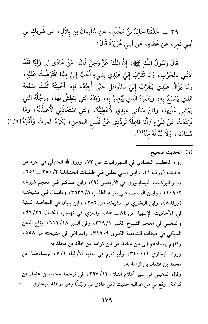39 - حَدَّثَنَا خَالِدُ بْنُ مَخْلَدٍ عَنْ سُلَيْمَانَ بْنِ بِلالٍ عَنْ شَرِيكِ بْنِ أَبِي نَمِرٍ عَنْ عَطَاءٍ عَنْ أَبِي هُرَيْرَةَ قَالَ قَالَ رَسُول اللَّه صَلَّى اللَّهُ عَلَيْهِ وَسَلَّمَ إِنَّ اللَّهَ عَزَّ وَجَلَّ قَالَ مَنْ عَادَى لِي وَلِيًّا فَقَدْ آذَنَنِي بِالْحَرْبِ وَمَا تَقَرَّبَ إِلَيَّ عَبْدِي بِشَيْءٍ أَحَبَّ إِلَيَّ مِمَّا افْتَرَضْتُ عَلَيْهِ وَمَا يَزَالُ عَبْدِي يَتَقَرَّبُ إِلَيَّ بِالنَّوَافِلِ حَتَّى أُحِبَّهُ فَإِذَا أَحْبَبْتُهُ كُنْتُ سَمْعَهُ الَّذِي يَسْمَعُ بِهِ وَبَصَرَهُ الَّذِي يُبْصِرُ بِهِ وَيَدَهُ الَّتِي يَبْطِشُ بِهَا وَرِجْلُهُ الَّتِي يَمْشِي عَلَيْهَا وَلَئِنْ سَأَلَنِي عَبْدِي لأُعْطِيَنَّهُ وَلَئِنِ اسْتَعَاذَنِي لأُعِيذَنَّهُ وَمَا تَرَدَّدْتُ عَنْ شَيْءٍ أَنَا فَاعِلُهُ تَرَدُّدِي عَنْ نَفْسِ الْمُؤْمِنِ يَكْرَهُ الْمَوْتَ وَأَكْرَهُ مُسَاءَتَهُ وَلا بُدَّ له منه.