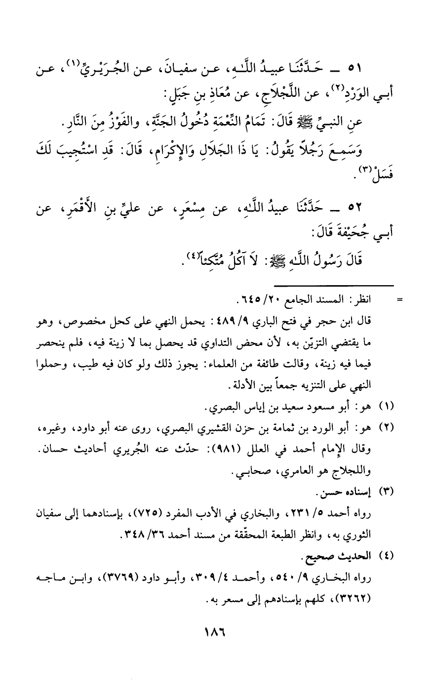 52 - حَدَّثَنَا عُبَيْدُ اللَّهِ عَنْ مِسْعَرٍ عَنْ عَلِيِّ بْنِ الأَقْمَرِ عَنْ أَبِي جُحَيْفَةَ قَالَ قَالَ رَسُولُ اللَّهِ صَلَّى اللَّهُ عَلَيْهِ وَسَلَّمَ لا آكل متكئا.