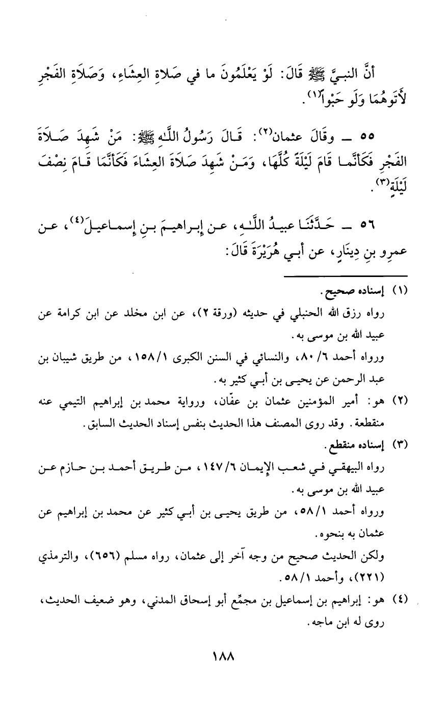 55 - وَقَالَ عُثْمَانُ قَالَ رَسُولُ اللَّهِ صَلَّى اللَّهُ عَلَيْهِ وَسَلَّمَ مَنْ شَهِدَ صَلاةَ الْفَجْرِ فَكَأَنَّمَا قَامَ لَيْلَةً كُلَّهَا وَمَنْ شَهِدَ صَلاةَ الْعِشَاءَ فكأنما قام نصف ليلة.