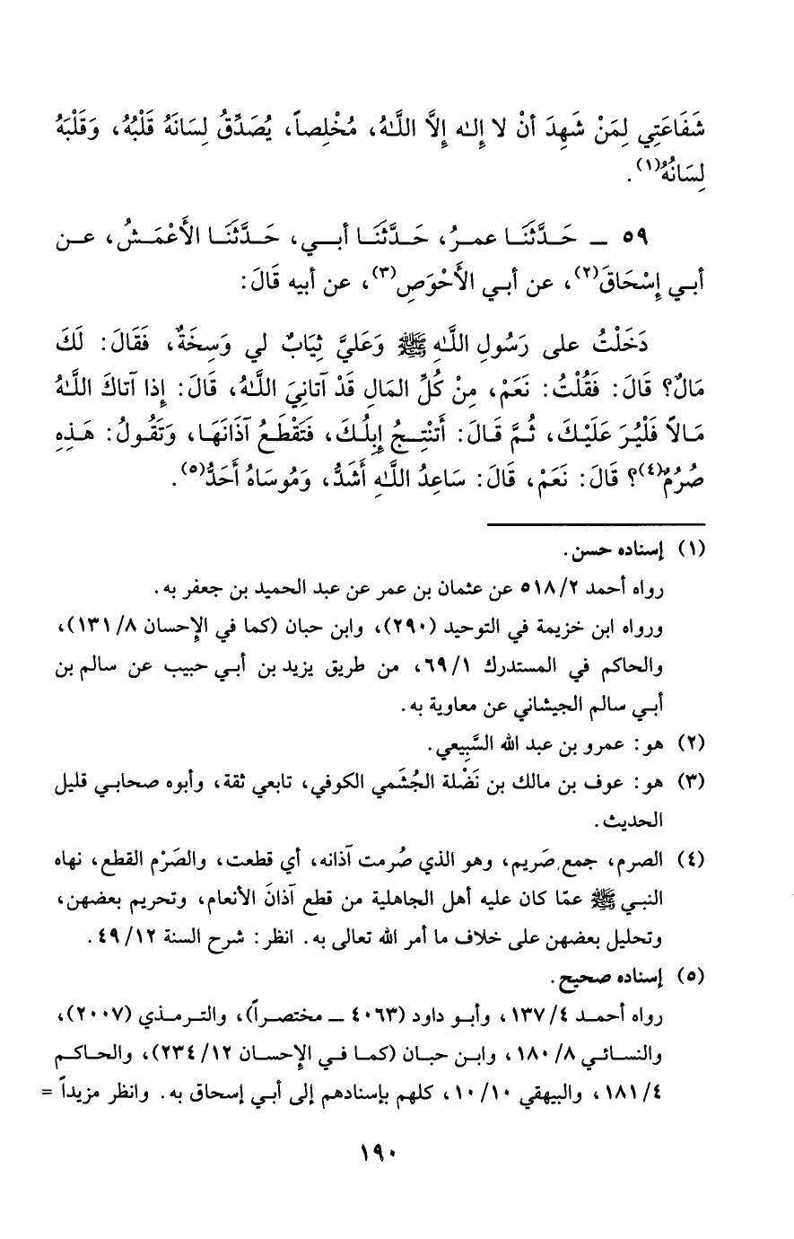 59 - حَدَّثَنَا عُمَرُ حَدَّثَنَا أَبِي حَدَّثَنَا الأَعْمَشُ عَنْ أَبِي إِسْحَاقَ عَنْ أَبِي الأَحْوَصِ عَنْ أَبِيهِ قَالَ دَخَلْتُ عَلَى رَسُول اللَّه صَلَّى اللَّهُ عَلَيْهِ وَسَلَّمَ وَعَلَيَّ ثِيَابٌ لِي وَسِخَةٌ فَقَالَ لَكَ مَالٌ قَالَ فَقُلْتُ نَعَمْ مِنْ كُلِّ الْمَالِ قَدْ آتَانِي اللَّهُ قَالَ إِذَا آتَاكَ اللَّهُ مَالا فَلْيُرَ عَلَيْكَ ثُمَّ قَالَ أَتَنْتِجُ إِبِلُكَ فَتَقْطَعُ آذَانَهَا وَتَقُولُ هَذِهِ صُرُمٌ قَالَ نَعَمْ قَالَ سَاعِدُ اللَّهِ أَشَدُّ وَمُوسَاهُ أَحَدُّ.
