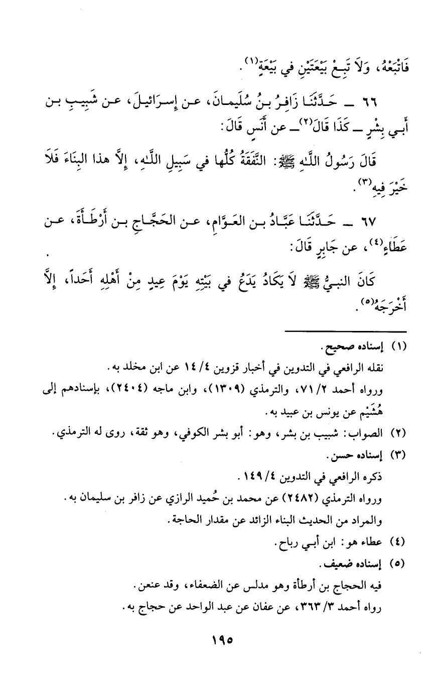 66 - حَدَّثَنَا زَافِرُ بْنُ سُلَيْمَانَ عَنْ إِسْرَائِيلَ عَنْ شَبِيبِ بْنِ أَبِي بِشْرٍ - كَذَا قَالَ - عَنْ أَنَسٍ قَالَ قَالَ رَسُولُ اللَّهِ صَلَّى اللَّهُ عَلَيْهِ وَسَلَّمَ النَّفَقَةُ كُلُّهَا فِي سَبِيلِ اللَّهِ إلا هذا البناء فلا خير فيه.