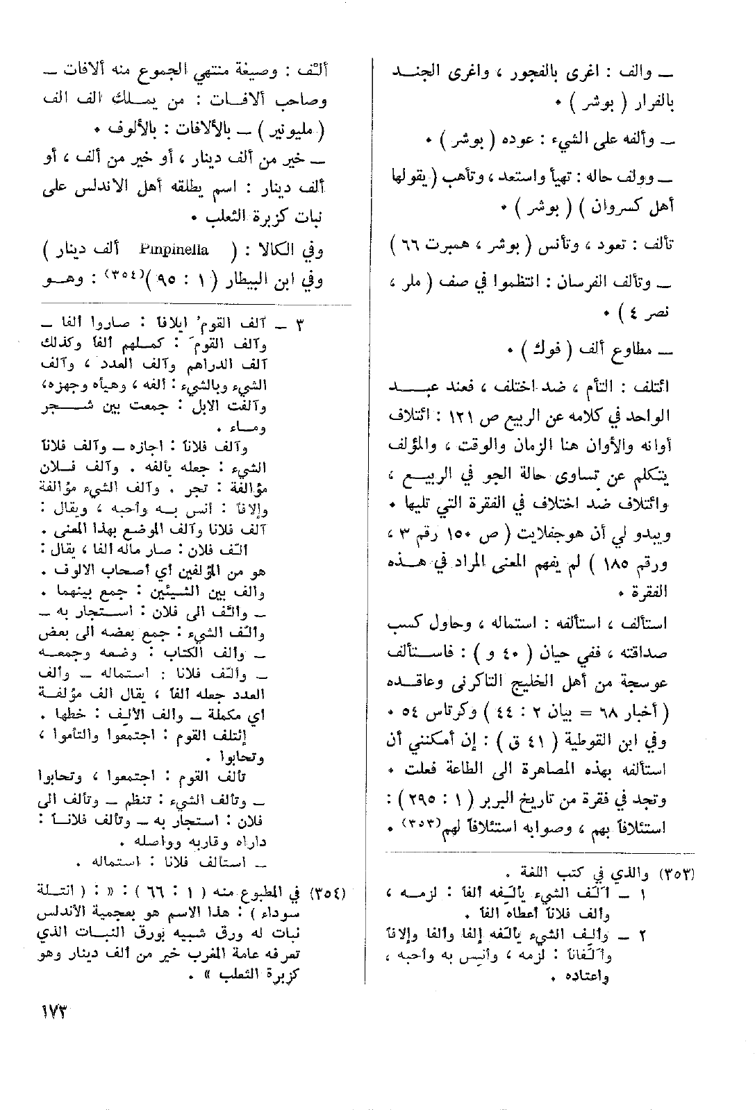 ائتلف: التأم، ضد اختلف، فعند عبد الواحد في كلامه عن الربيع ص121: ائتلاف أوانه والأوان هنا الزمان والوقت، والمؤلف يتكلم عن تساوى حالة الجو في الربيع، وائتلاف ضد اختلاف في الفقرة التي تليها. ويبدو لي أن هوجفلايت (ص150 رقم 3، ورقم 185) لم يفهم المعنى المراد في هذه الفقرة.